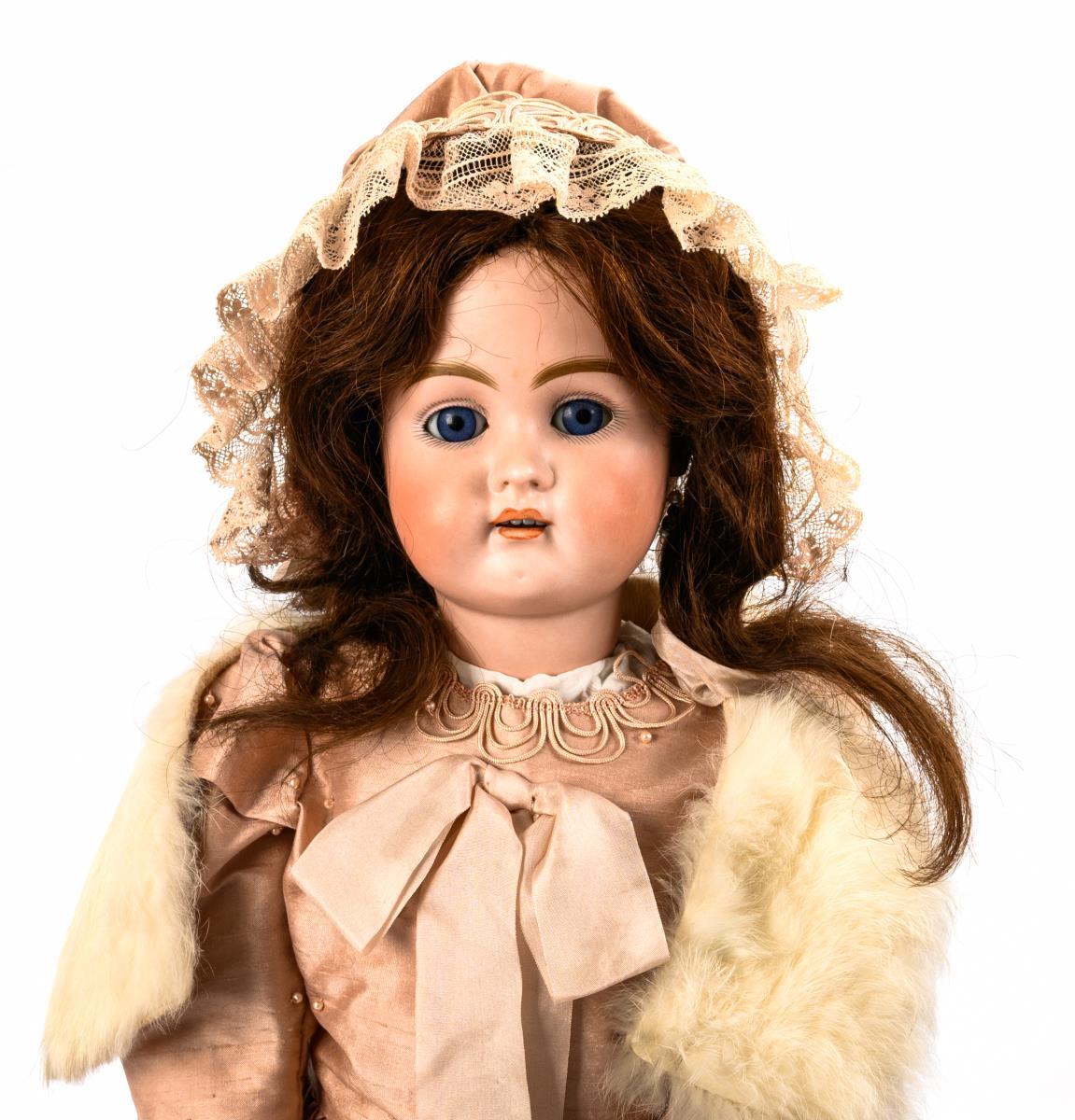 Doll lady with dusky pink dress and fur scarf. Baehr & Proeschild.