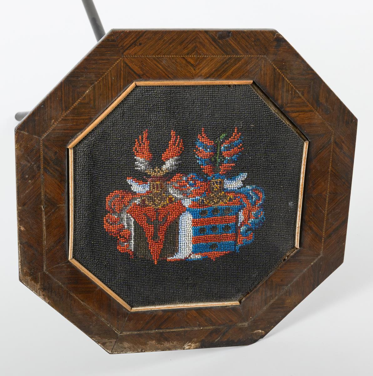 Delicate side table on 3 crossed legs, with octagonal top; decorated with inlaid pearl embroidery with the coat of arms of the Lords von der Gabelentz-Linsingen; label on the underside "Schlossmuseum Altenburg Inv.-Nr. SM 1427" and "M45". Signs of age/use, top with defects.
