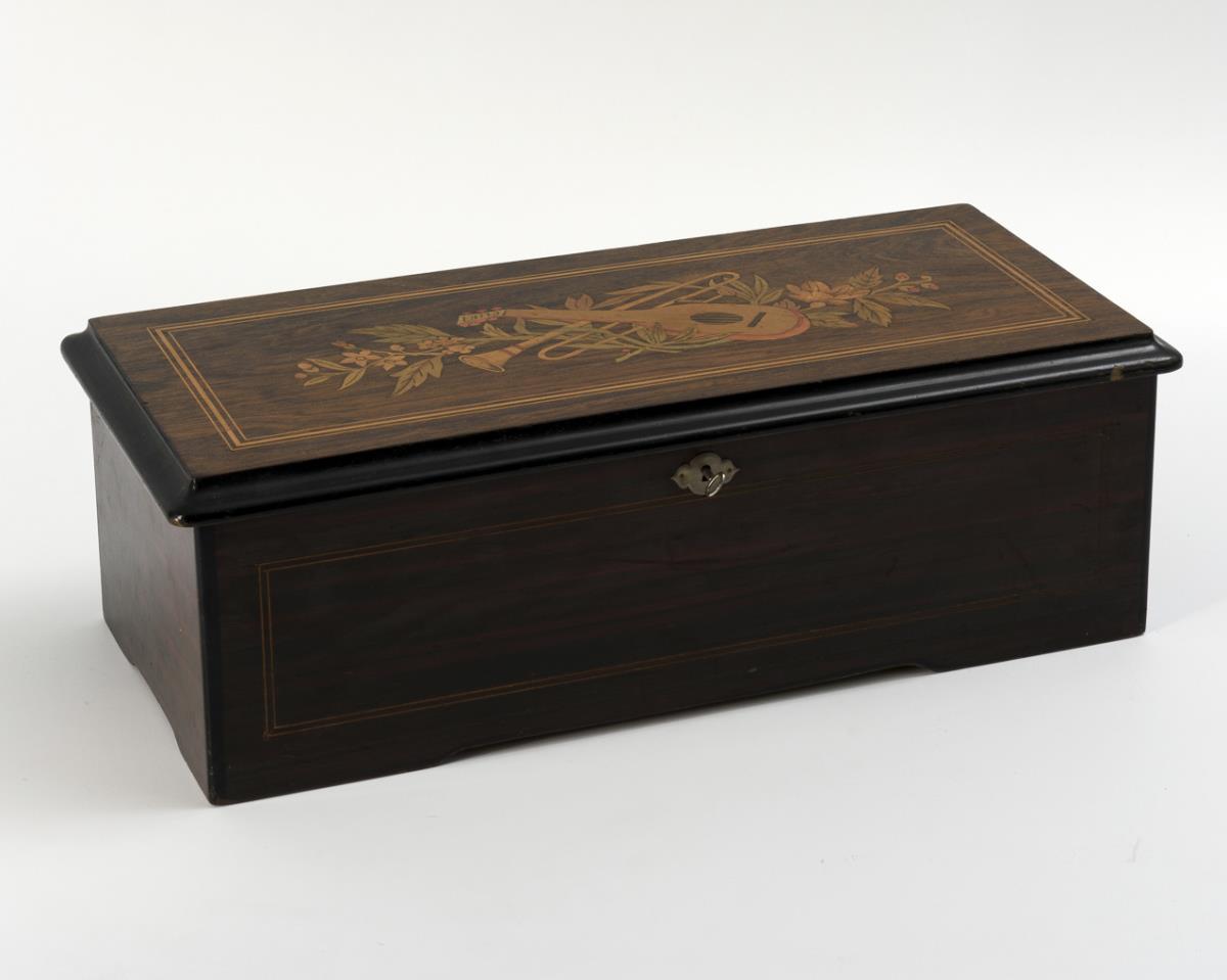 Palisander veneer, partly colored marquetry, imitation veneer, iron, brass and glass, movement with 8 songs, stone-mounted wind wheel. 17.5 x 53 x 24 cm, tongue comb 20 cm, cylinder 23 cm. 10.9 kg.