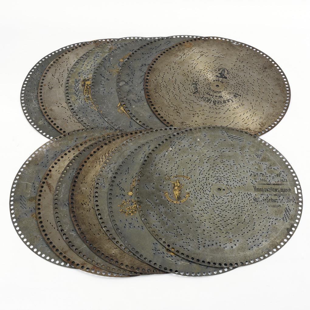 Large "music box" with moldings. "Engraving" with lyre on the hinged lid in the false cassette; color lithograph with company name and putti playing music on the lid. Tongue comb mounted on the star wheel on a gold-bronzed base plate and rim drive for plates with rim perforations. Polyphonically marked perforated plates, e.g. Ein Walzertraum, Loreley, Dolores, Auf den Wellen, Elfengrab, Bohemian etc. Some signs of age/use on the case and plates, 2 reeds restored. Movement plays with slight clanking noises, start function in need of overhaul, saw hole above the wind wheel. 1 plate with small chipping at the edge, 2 plates with edge crack, 2 plates with cracked edge.