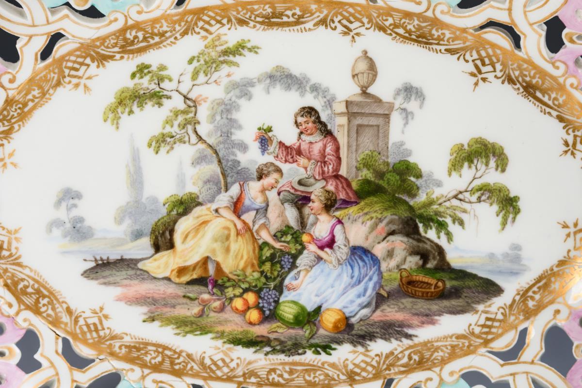 Oval bowl with flower openwork, the mirror depicting a park landscape with two rococo ladies and a gardener with fruit. Fire cracks in the rim, partial gold abrasion.