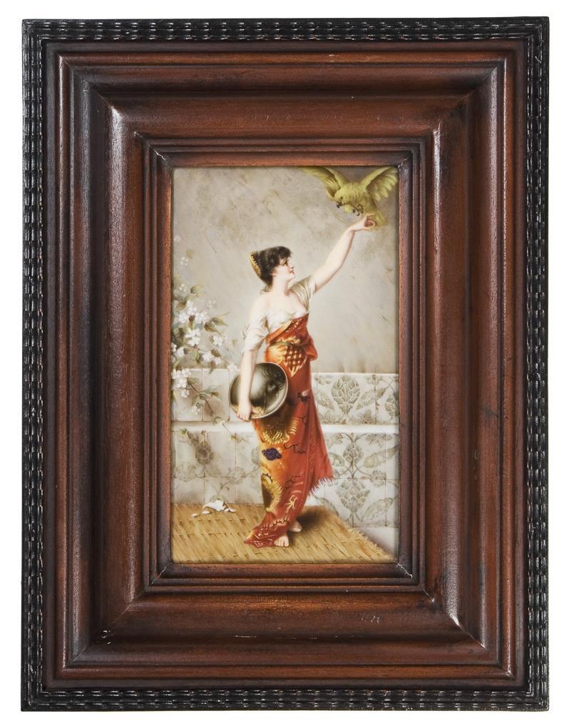 Fine color painting after a painting by Conrad Kiesel (1846 Düsseldorf - 1921 Berlin), painted in 1884, illustrated in the illustrated magazine "Moderne Kunst". Unsigned, inscribed on old label on the reverse. Unglazed base, without mark. Profiled flambeau frame in mint condition.