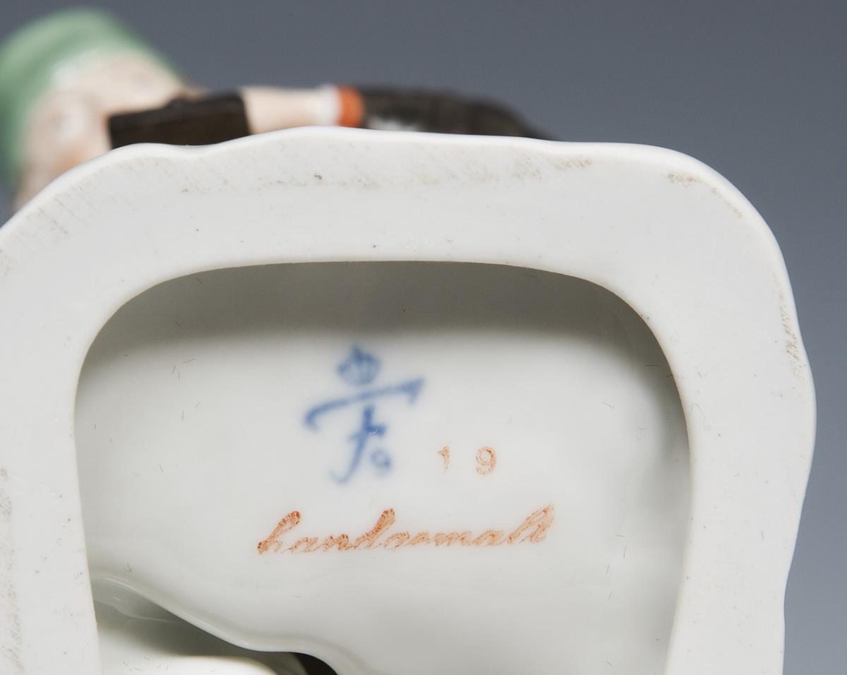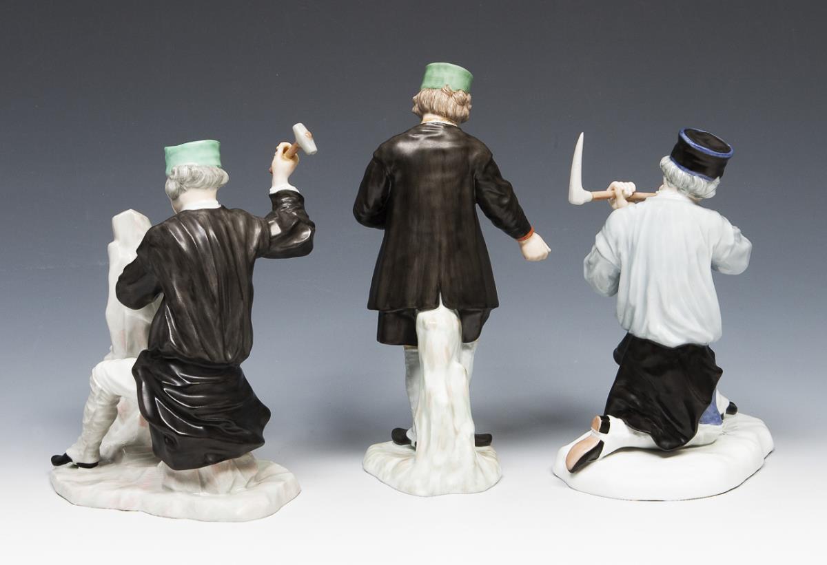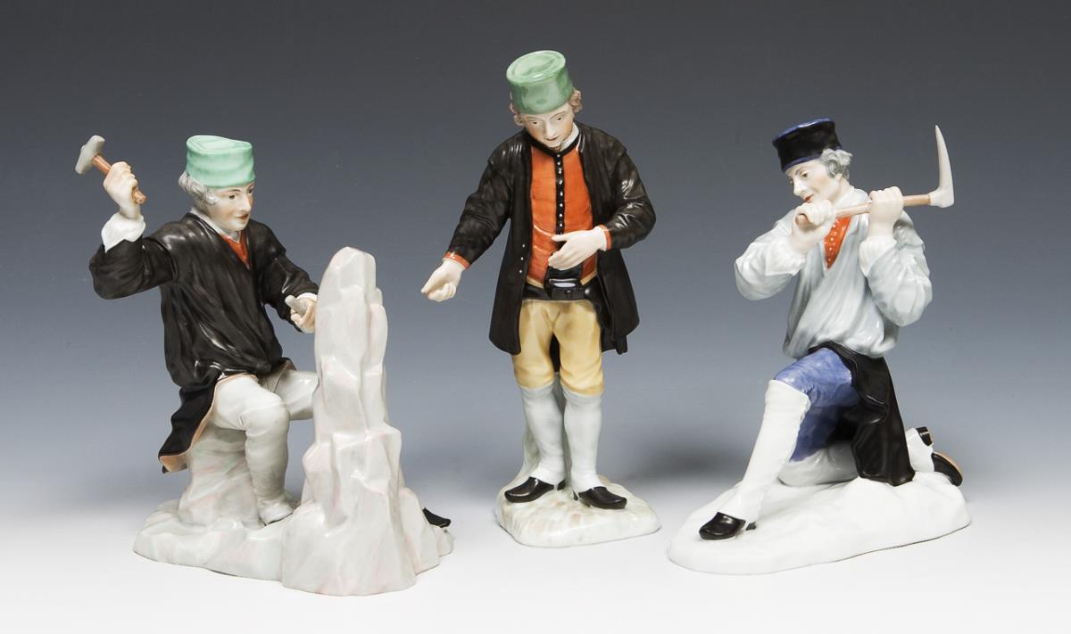 Model by Simon Fellner 1757. Marksman with compass, "Einer, der unter sich schrämet", Gedingearbeiter. Painted in color, crowned F-marks, red lettering: hand-painted. Glued handles.