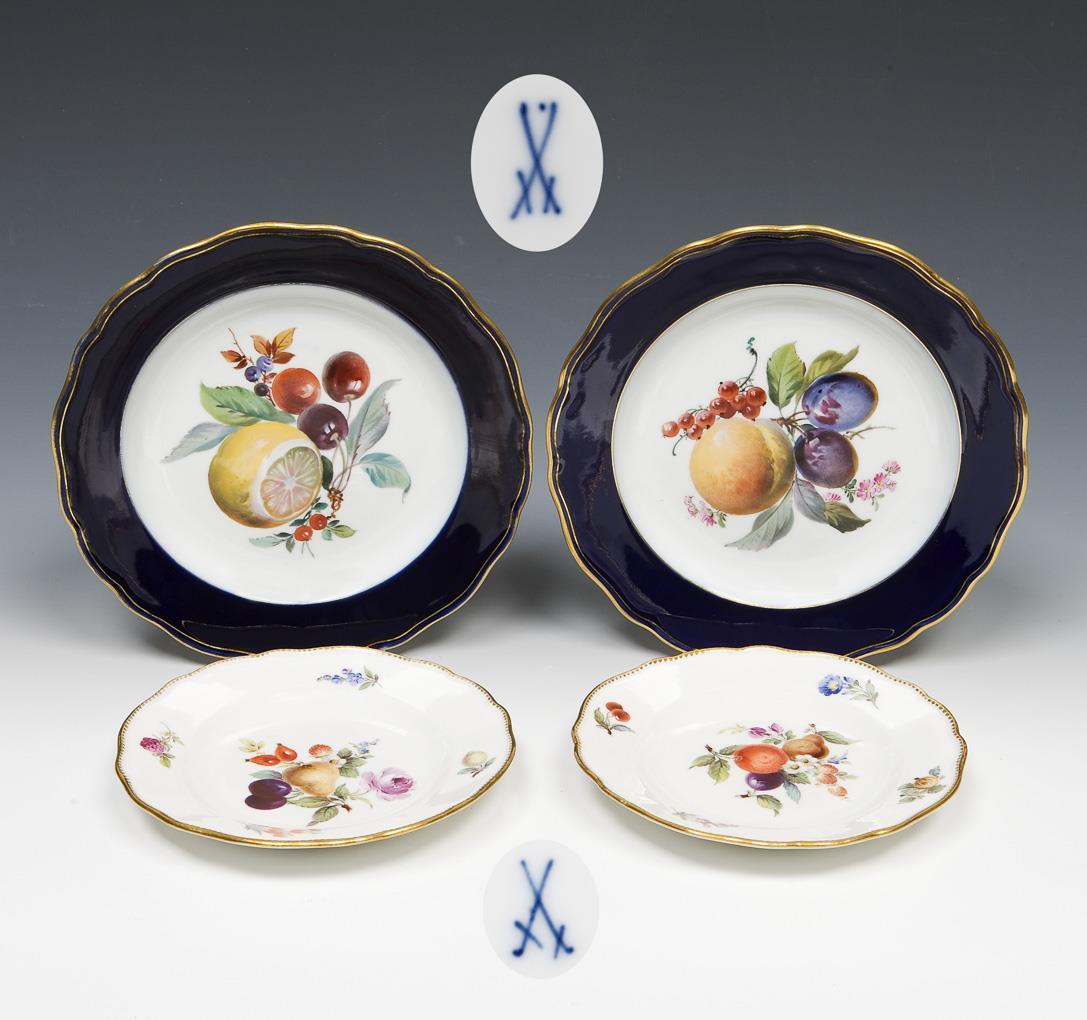 Form "Neuer Ausschnitt", fine colored painting "Reiche Fruchtmalerei", gold painted. Two plates with cobalt blue rim, two plates with gold edging. Press marks, painter's marks, sword marks, two sword marks with dot.