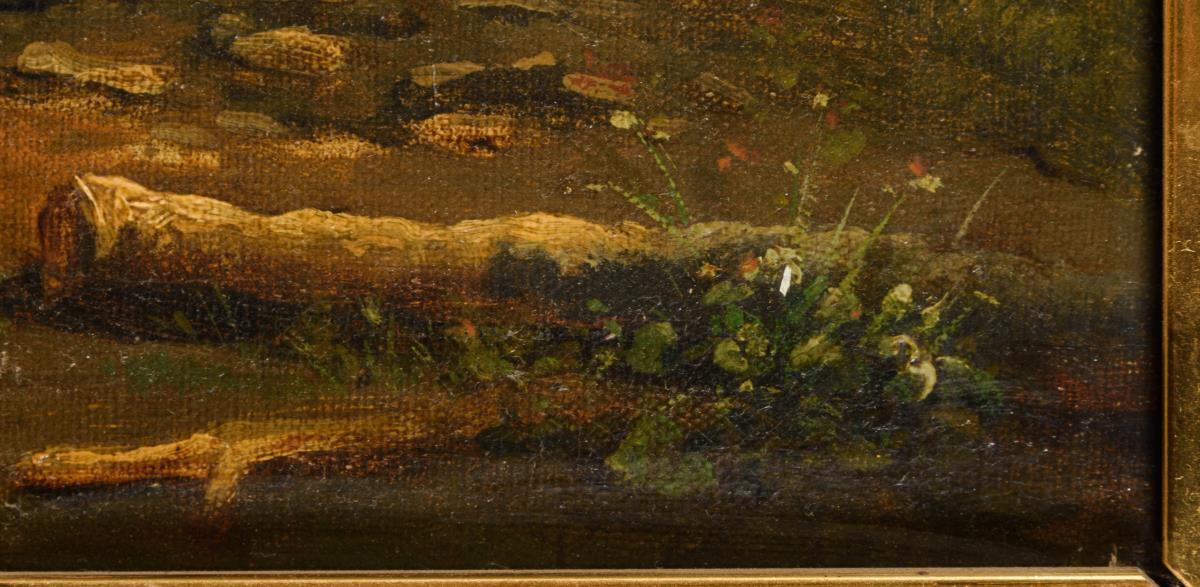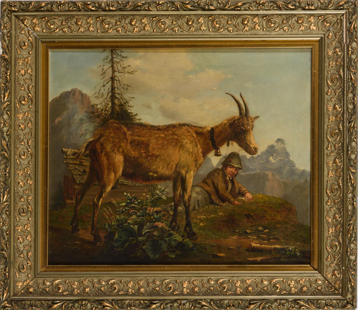 Monogrammist LH od. SH: Ziege mit Hütejungen. Öl/Lwd., re. u. monogr. u. undeutl. dat: 185?. Die Ziege m. Halsglocke im Bildzentrum auf einem Berg- vorsprung, vor dessen Abgrund ein Junge im Gras liegt, während im Hintergrund eine Hütte vor den Gipfeln zu sehen ist. Leicht restauriert, doubliert. 35x41 cm, in Goldstuckleiste. Wenn Ludwig Hartmann, dann & Th/B. 16/84: Maler u. Radierer in München (1835 ebd.-1902 ebd.), stud. an Akad. ebda., Unterricht bei Wagner-Deines. ABB B 305, Monogr. ABB B 355 wohl 7% alt retuscht(haptsächlich Ecke li.u. Gesicht nicht) Ich lese S.H. 185? Ludwig Hartmann ohne ? eingel. 11.1.04: Monogr. SH od. LH, Wenn dann ok..