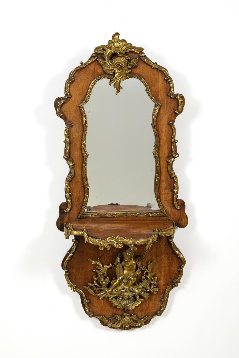 Delicate mirror console in a curved shape typical of the style, with shelf, decorated with sculpted bronze putti and lavish bronze fittings. Signs of age/use.