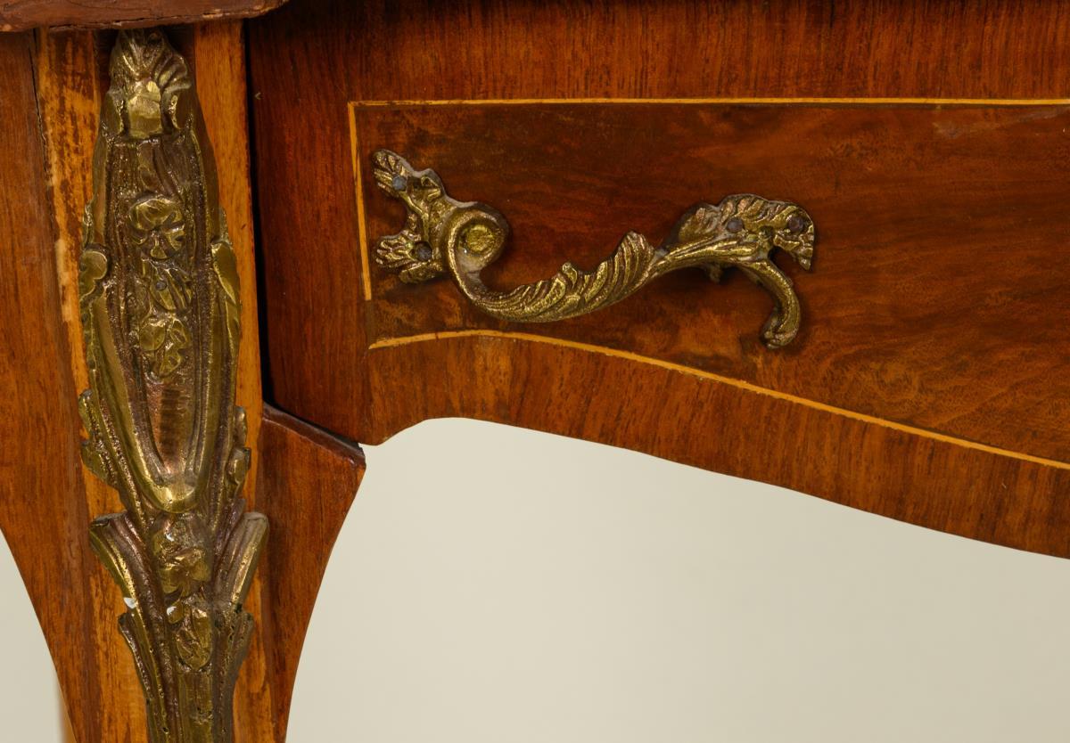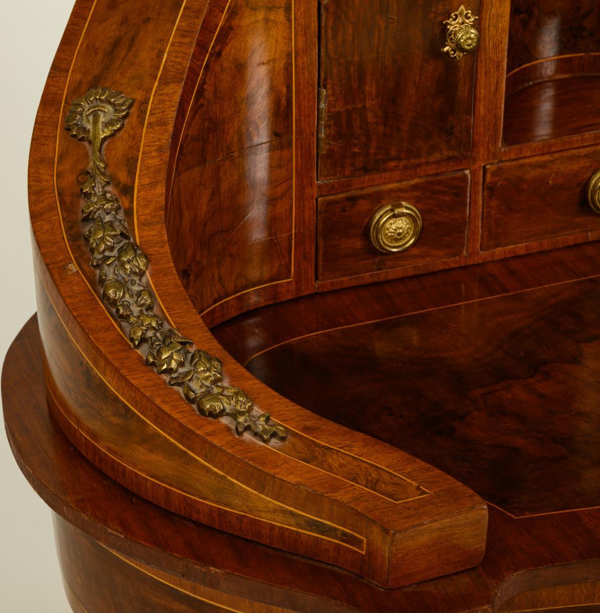 Delicate ladies' top desk in curved design, on 4 flared pillar legs, drawer frame and organically shaped top with aedicule, 3 small drawers and 2 1-door compartments; decorated with burl veneer and fine ribbon inlays, bronze crowning and fittings. Signs of age/use, veneer with dry cracks and minimal worm damage, top slightly warped and removable.