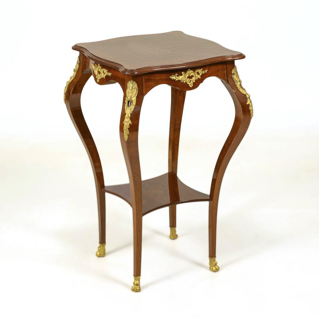 Square table with curved top, inlaid diamond pattern and profiled edge, on a curved frame and 4 s-shaped curved legs with concave-cut shelf, floral bronze mounts and paw feet. Slight signs of wear, minor defects in places.