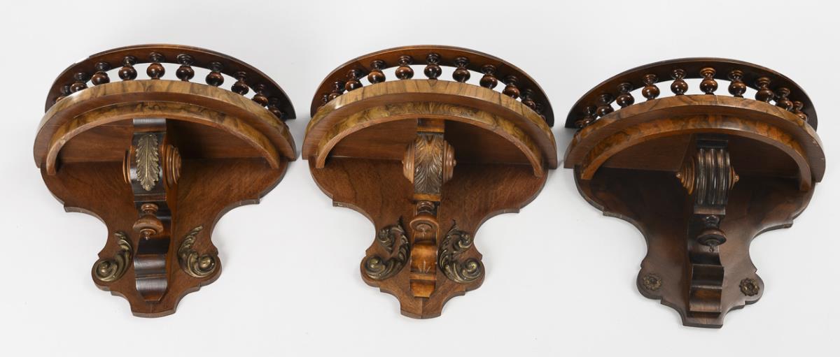 Consoles of the same basic shape with semi-circular balustrade and curved base board with volute support. Slightly differing decorations and appliqués. Minimal veneer repairs.