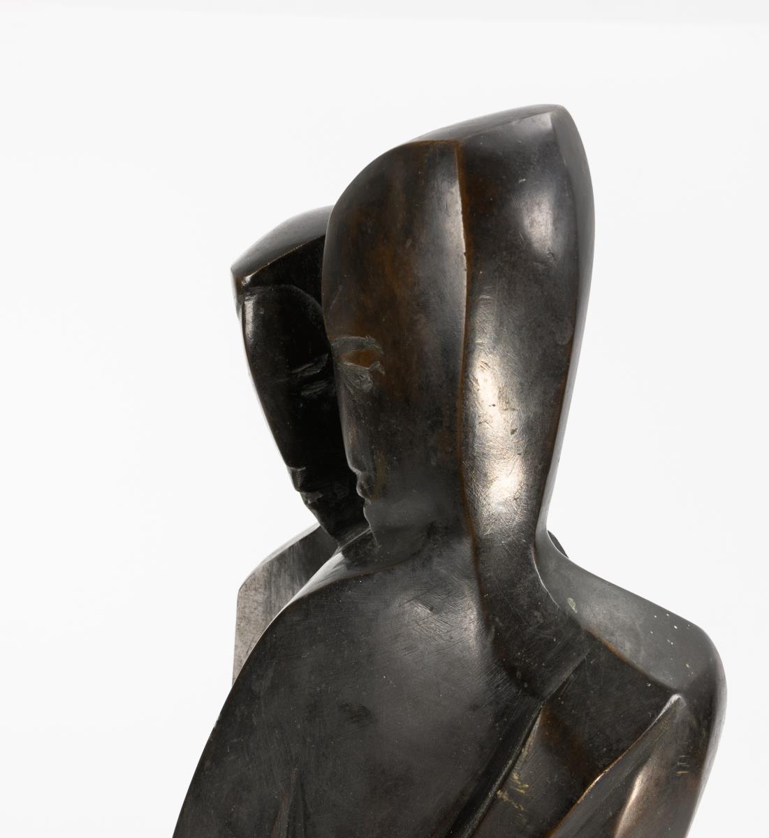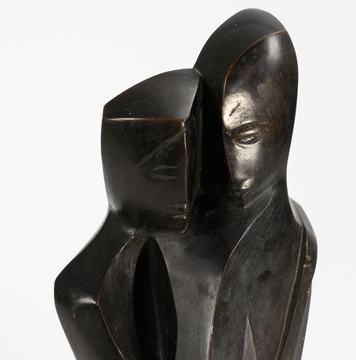 Tightly entwined couple with angular contour lines. Patina rubbed, few spots of paint.