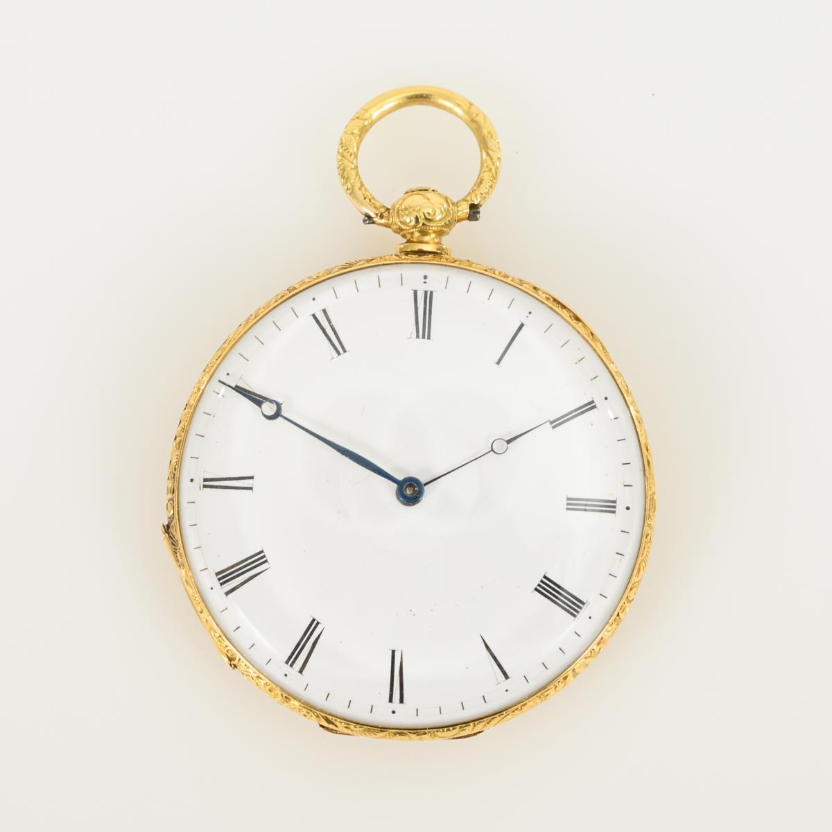 Chased lepine case with elaborate foliate decoration and an empty coat of arms reserve. Inner lid with scratch marks, dial finely hairline cracked, 1 hand replaced, movement restored.