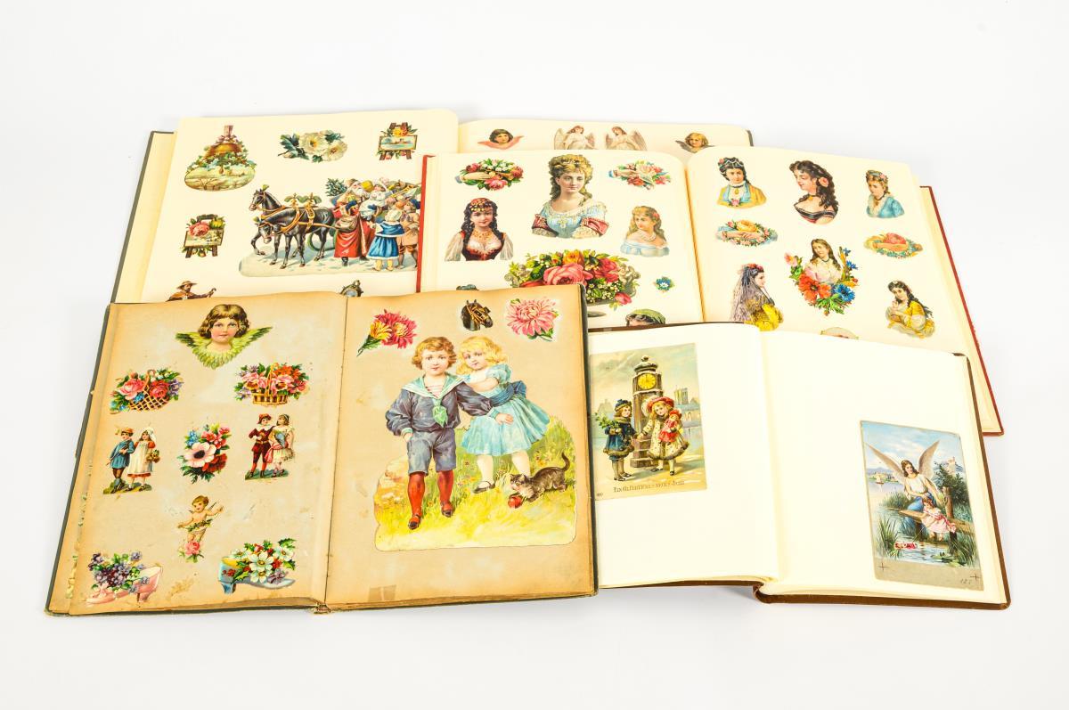Glued-in, partly large wafers of various themes: Children, Christmas, flowers, Easter, animals, ships (e.g. large Mississippi steamer), lovers, ladies and gentlemen, circus, angels. 1 small album approx. 25% filled with greeting cards, Stollwerck trading cards, guardian angels etc. 1 album strong signs of age/use with traces of glue inside. Otherwise albums a few traces of age/use.