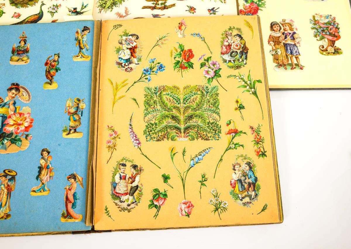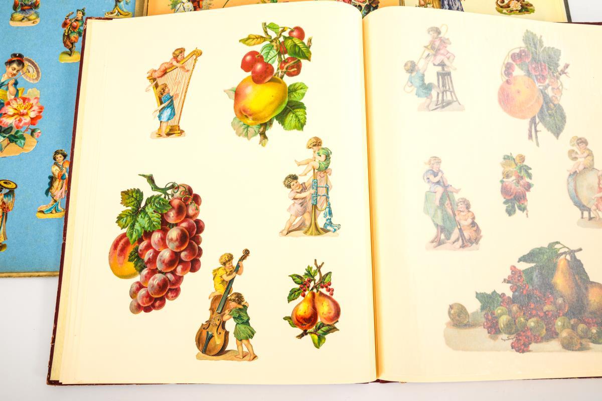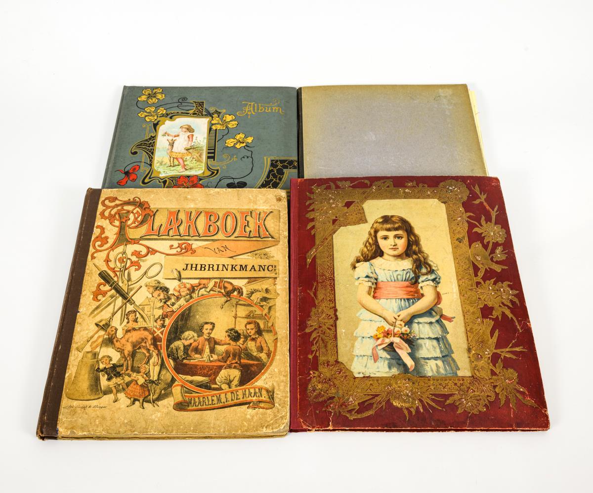 3 covers with color lithographs. Each with glued-in, partly large wafers of various themes: Children, ladies and gentlemen (partly chivalry and Renaissance), Christmas, funfair, animals (partly caricature), village and fairy tale scenes, flowers, fire department, carnival, folklore etc. Albums partly with signs of age/use (1 album with torn book block), partly traces of glue.