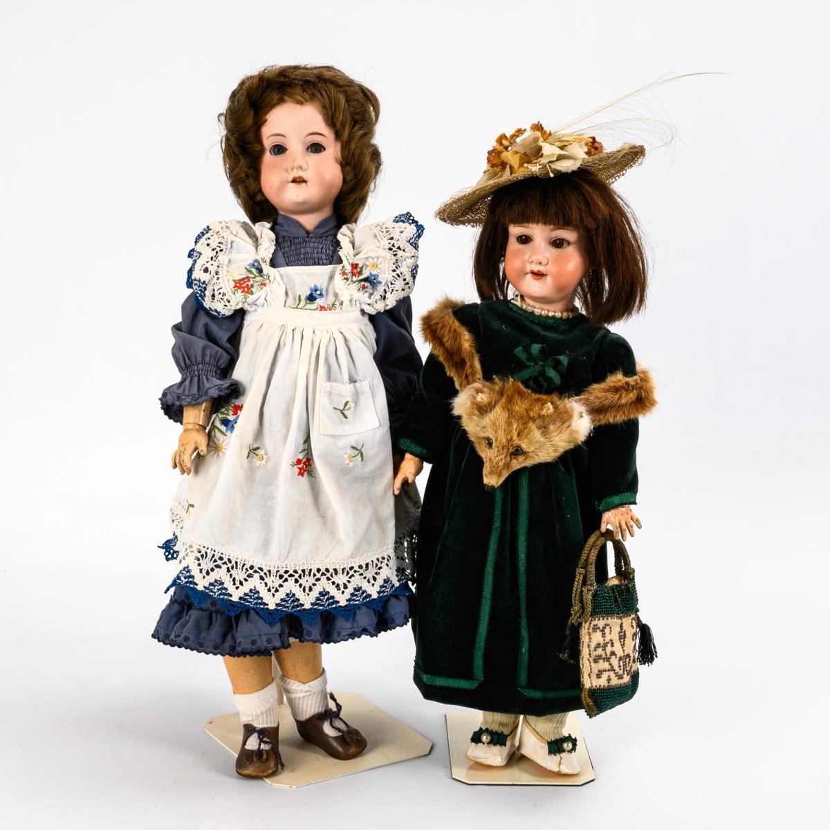Both with crank head, sleeping eyes, brown wig and multi-part jointed body. 1x with green velvet dress and fox stole (L 50 cm), 1x with added wig and embroidered apron (L 57 cm). Both with small chip to the neck crank, 1x AM head not x-rayed. Body each with small knocks and defects.