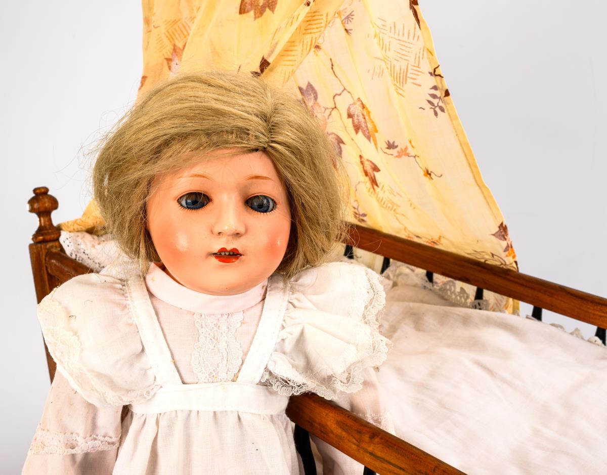 Solid cherrywood cradle with canopy and bedding. Wood partly with chips and small defects (61 x 27.5 x 68 cm). Celluloid head doll with blue eyes, blond human hair wig, oilcloth body, celluloid forearms, white dress and wine-red shoes. Cheeks somewhat rubbed (L 50 cm).
