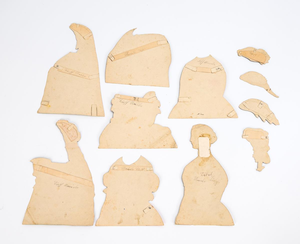 Unusual doll in side profile, with 6 costumes (2 with fixed headdresses) and 4 loose hairstyles. Mostly inscribed in pencil on the reverse. In original portfolio (33 x 26 cm). Small backing and creases, portfolio stained with defects.