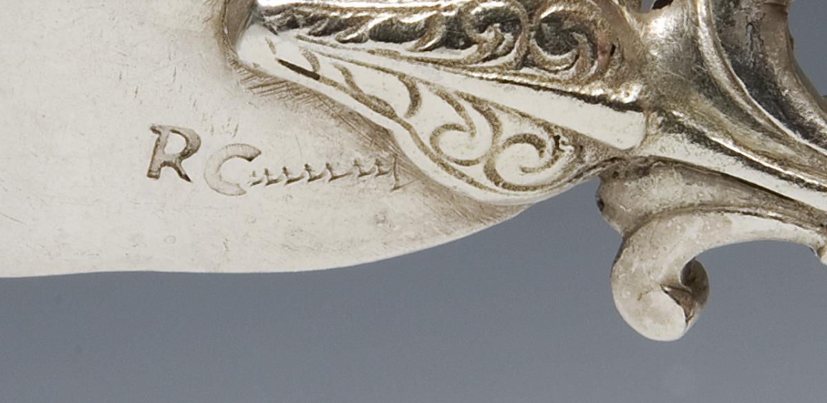 Chased and cast, the stems with winged angel heads, female busts, mascarons and shell finials in ornamental relief on both sides. Curved, deep-moulded bowls, hallmarks: RC, tremmeling stroke.