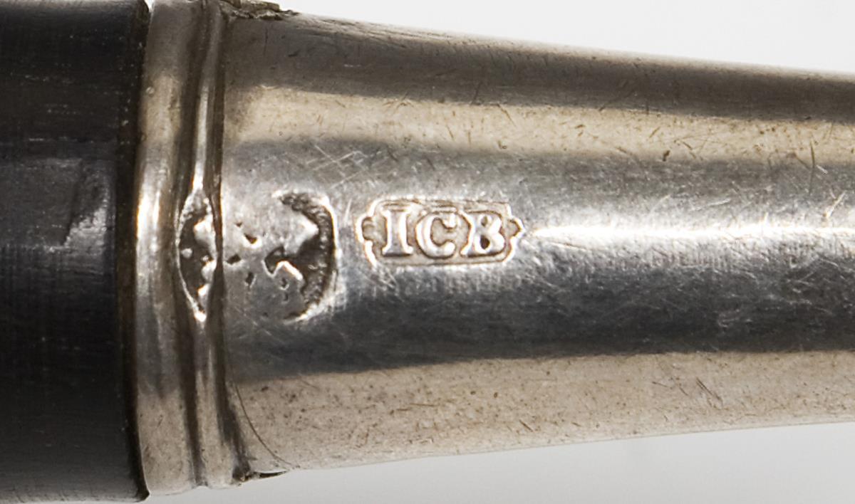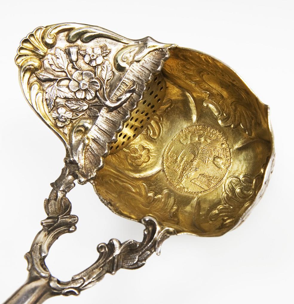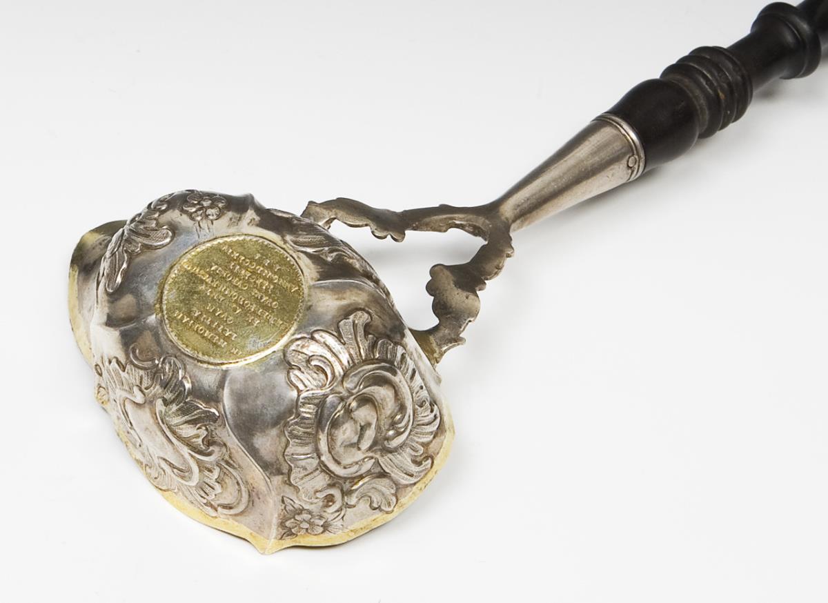 Inlaid Russian token from 1764 on the visit of Tsarina Catherine the Great to Ernst Johann von Biron, Duke of Courland and Semgallen (1690-1772) in the Electoral capital Mitau. The token: palm tree with the coat of arms of the Electorate of Courland in the center of the front, castle and city view of Mitau on the side, radiant sun at the top, part of the zodiac, above: SIDERIS ASPECTU BEATA, inscription with date on the reverse: IN MEMORIAM LAETITIAE QUAM EX ADVENTU SER: ET POT: OMN. RUSS: IMP: OVANS CURONA PERCEPIT ANNO MDCCLXIV. Turned curved wooden handle with silver cuff. Hallmarks: City mark, master's mark ICB. Jeton with small scratch, spoon partially restored at the rim.