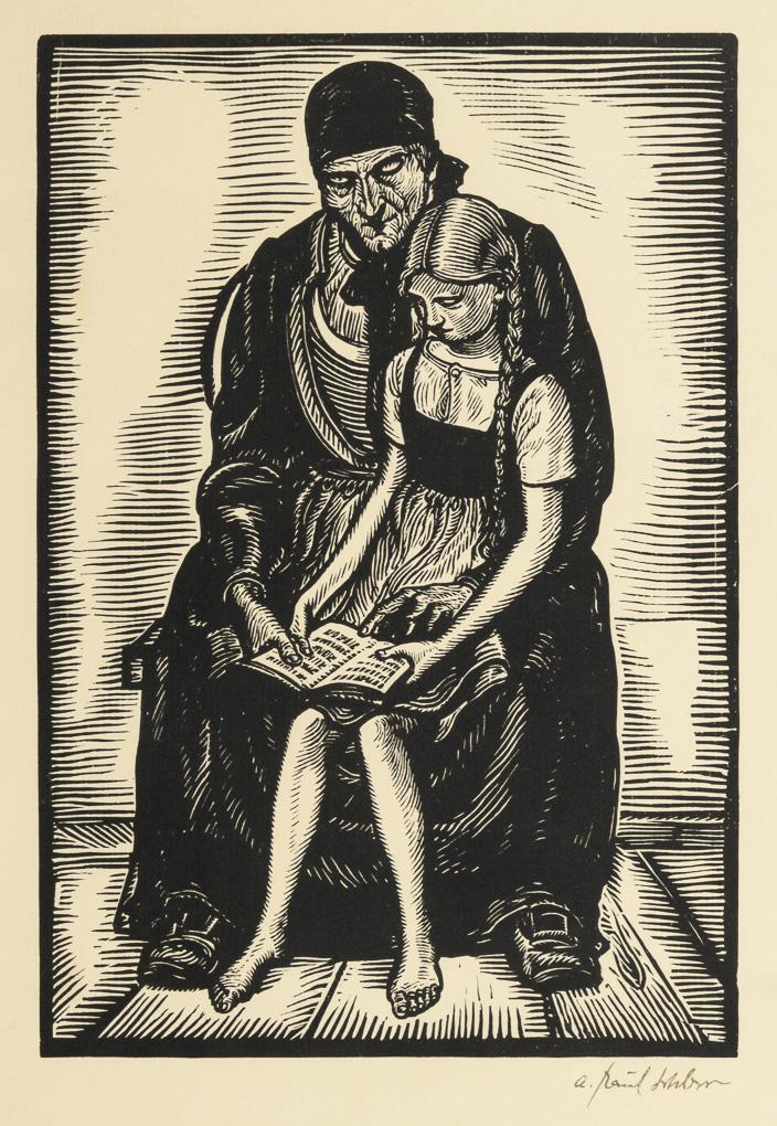 Granddaughter reading with her grandmother on her lap. The artist only printed woodcuts until the end of the Second World War.
