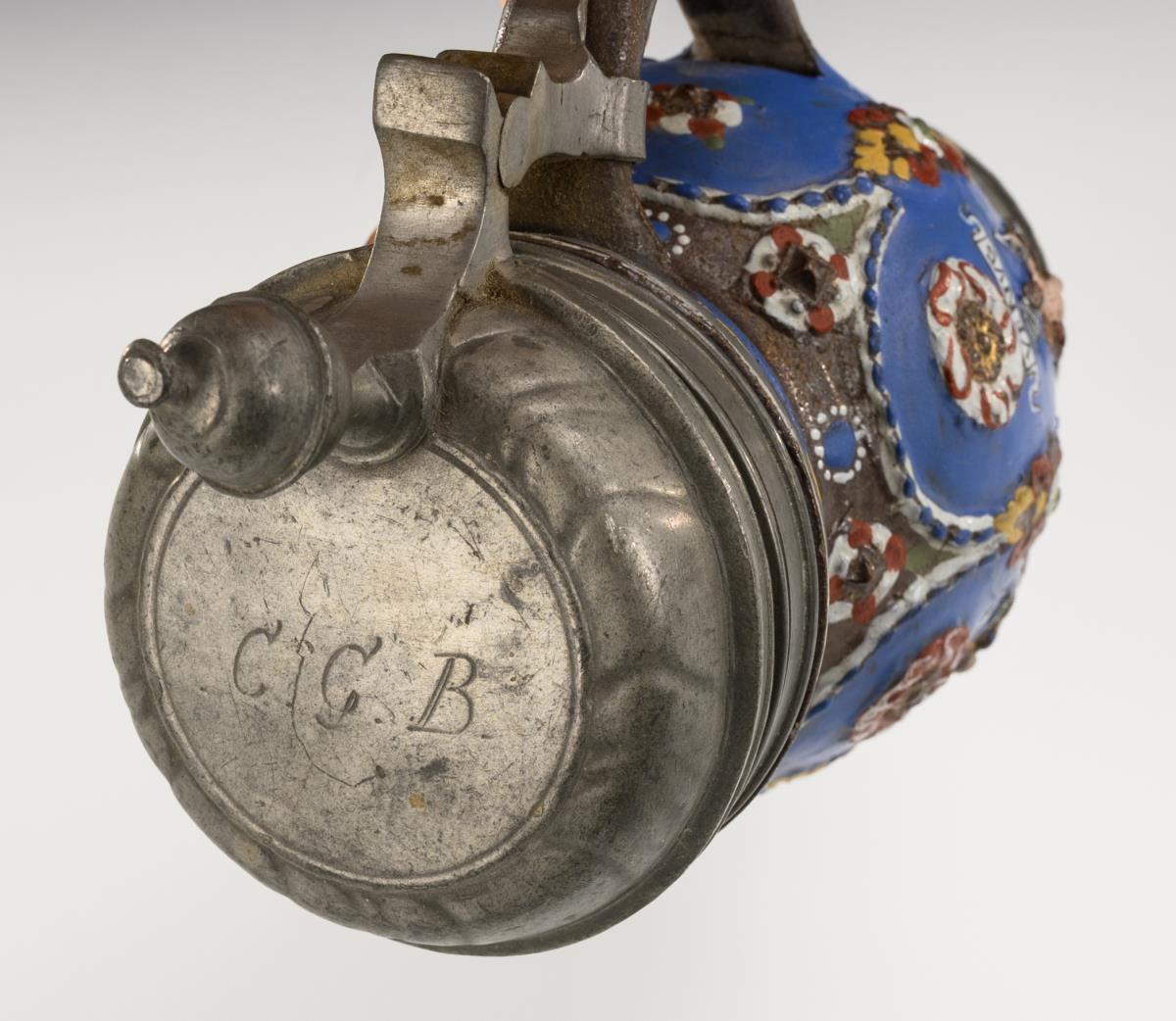Relief jug with six-lobed wall, cylindrical neck and stepped stand, profiled strap handle. On the wall 6 blue reserves with 5 inscribed personifications of the planets, decorated with corded ribbons, foliage and applied rosettes, a toast on the neck, dated "1670" below the handle. Godroned pewter lid with engraving "CGB" and ball finial, old hand-engraved interior, pewter rims and pewter stand ring. Slight signs of age, some glaze and gold rubbed, a fine crack to the neck, pewter lid bent.