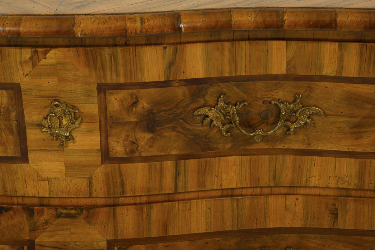 2-bay body with curved front and mock coffering, curved frame, on 4 feet. Floral bronze fittings, 1 original lock for both drawers. Signs of age and wear, veneer repairs, drawers newly lined on the inside with striped printed foil.