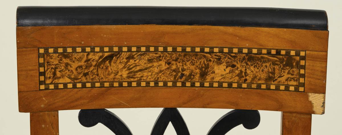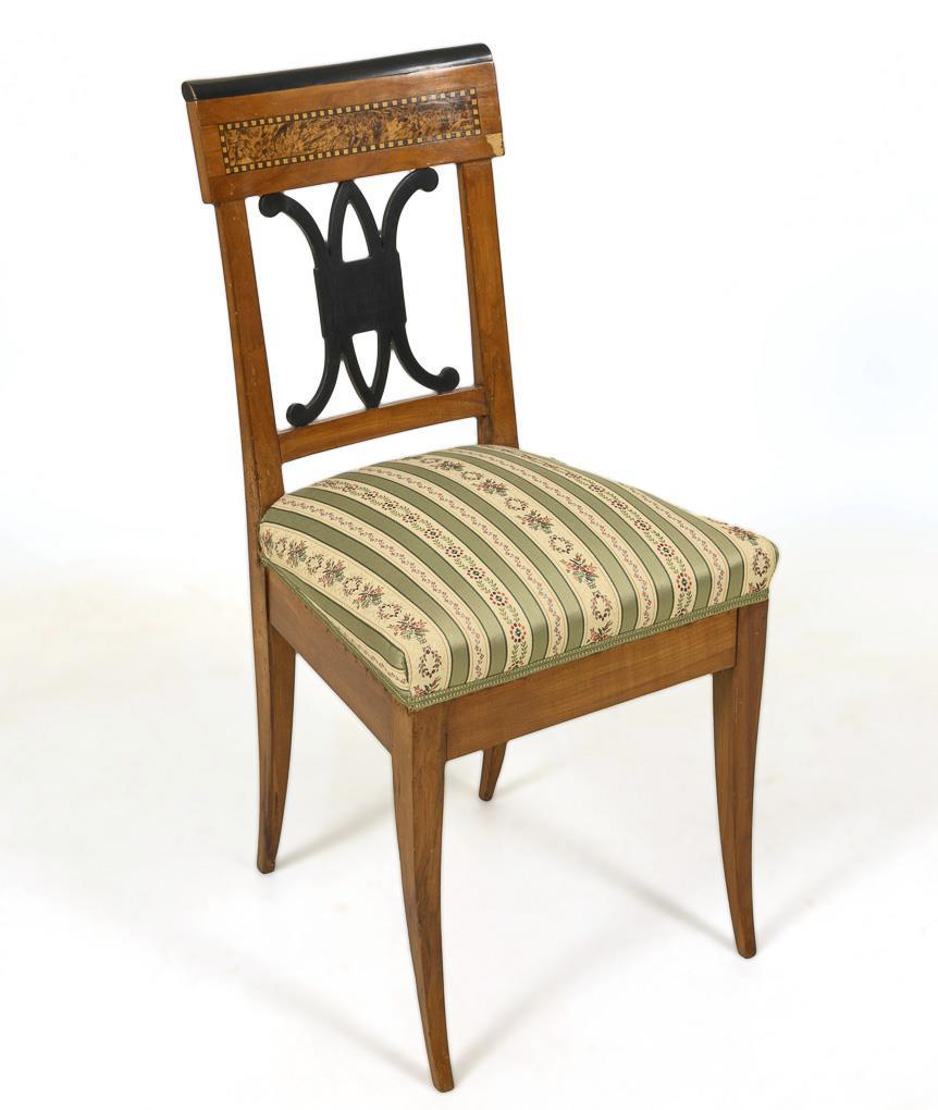 Backrest with a straight shoulder board, inside a burlwood ash box with chessboard framing, ornamental central bar, conical upholstered seat with jacquard striped fabric, on 4 slightly curved pointed legs. Restored, 1 veneer defect, slight signs of age and wear.