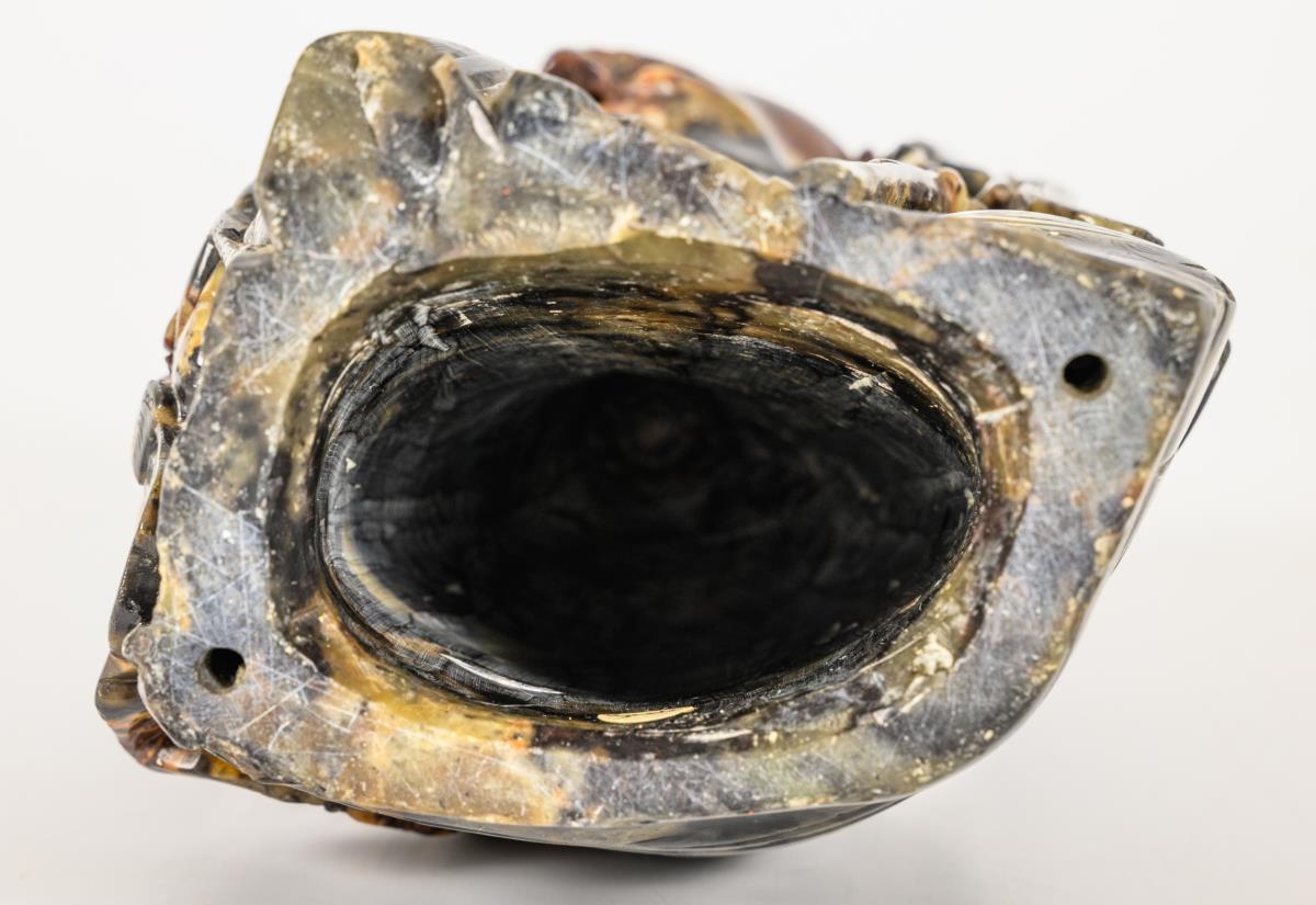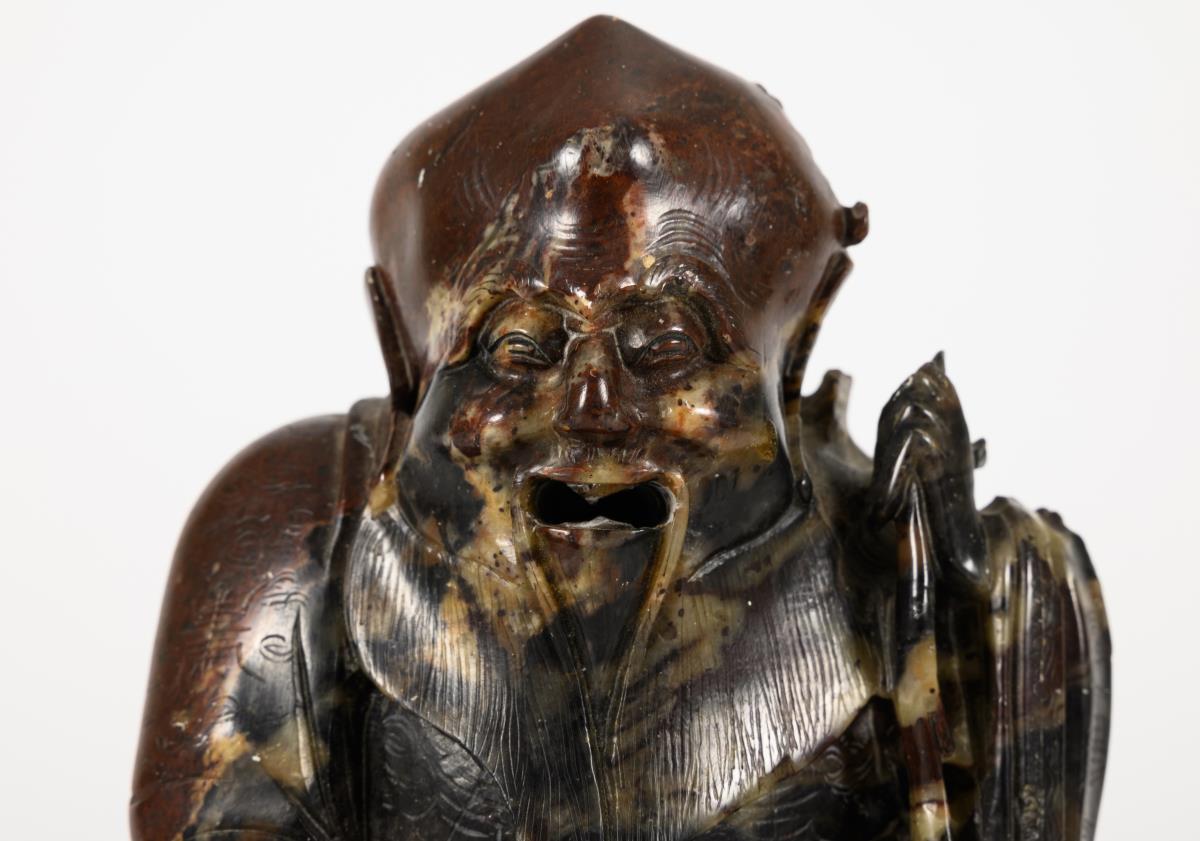 Black-brown-grey soapstone. Old man with a stick and an animal on his lap. Open mouth and ears; hollow inside. Probably missing parts on the animal and the stick.
