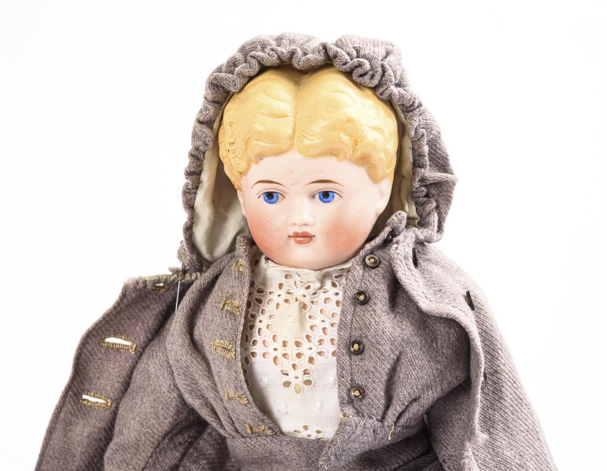 Doll with painted blue eyes and sculpted hair. Leather body with mass links. Gray costume with hooded cape, l 43 cm. Comes with a 3-tier chest of drawers with marble top, 18 x 18 x 10 cm. No visible defects to the head, body with repairs.