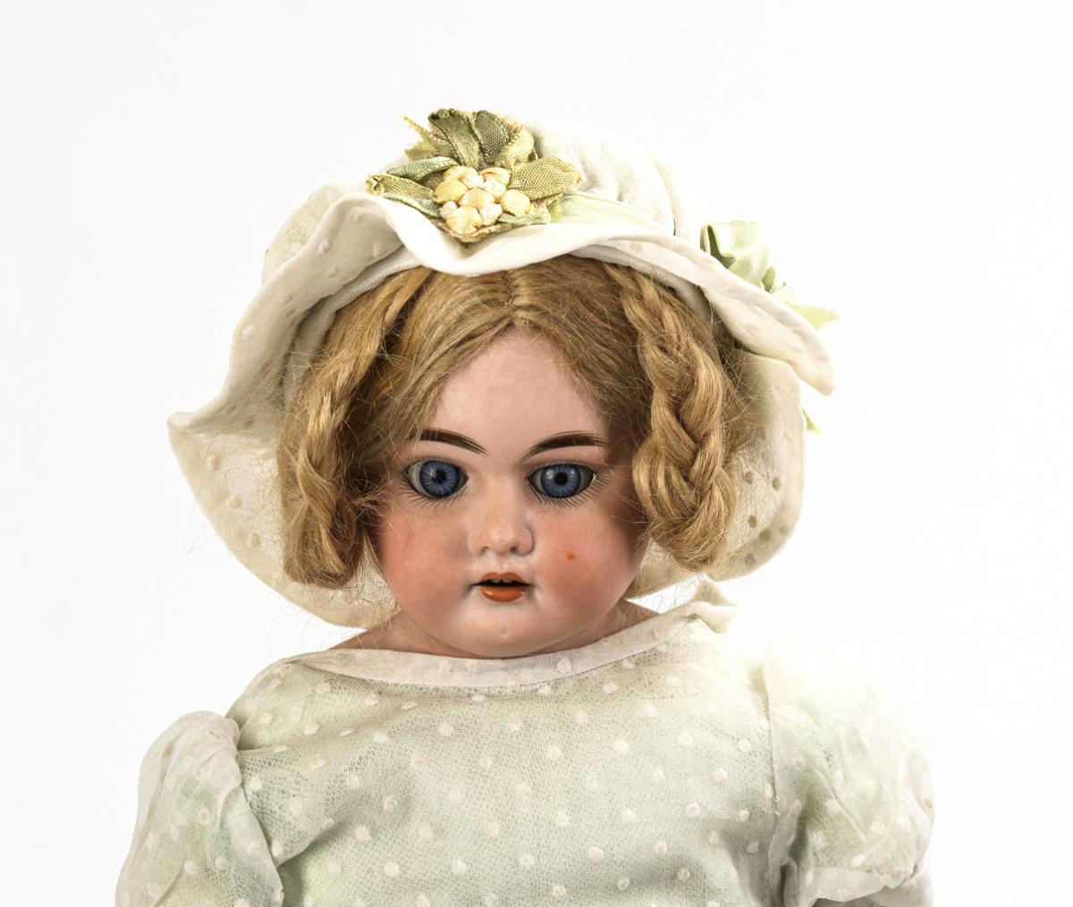 Both with chest head, blue glass eyes, mohair wig and bisque forearms. 3200: with oilcloth body, light green dress and matching hat, l 56 cm. / Florodora: with leather body, dressed as a kitchen maid with flowered dress, white apron and bonnet. Restored right hand, l 57 cm. Heads without visible defects (1x x-rayed).