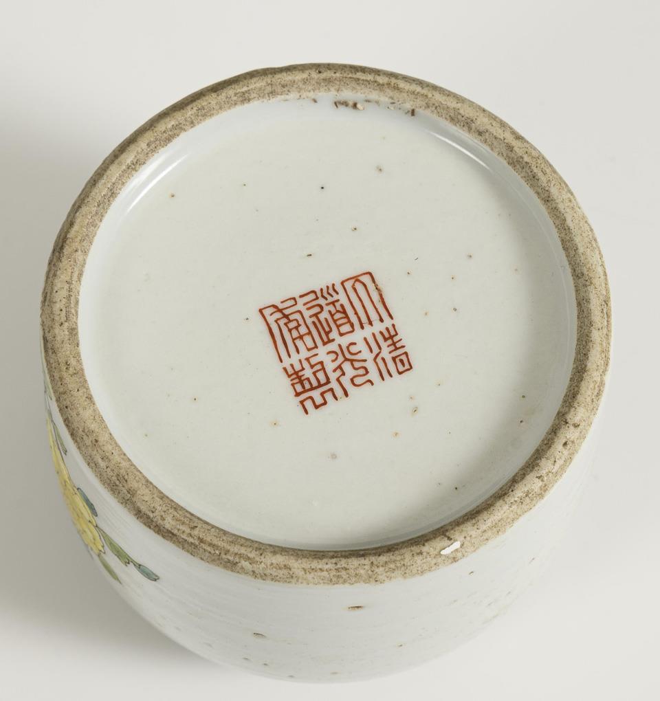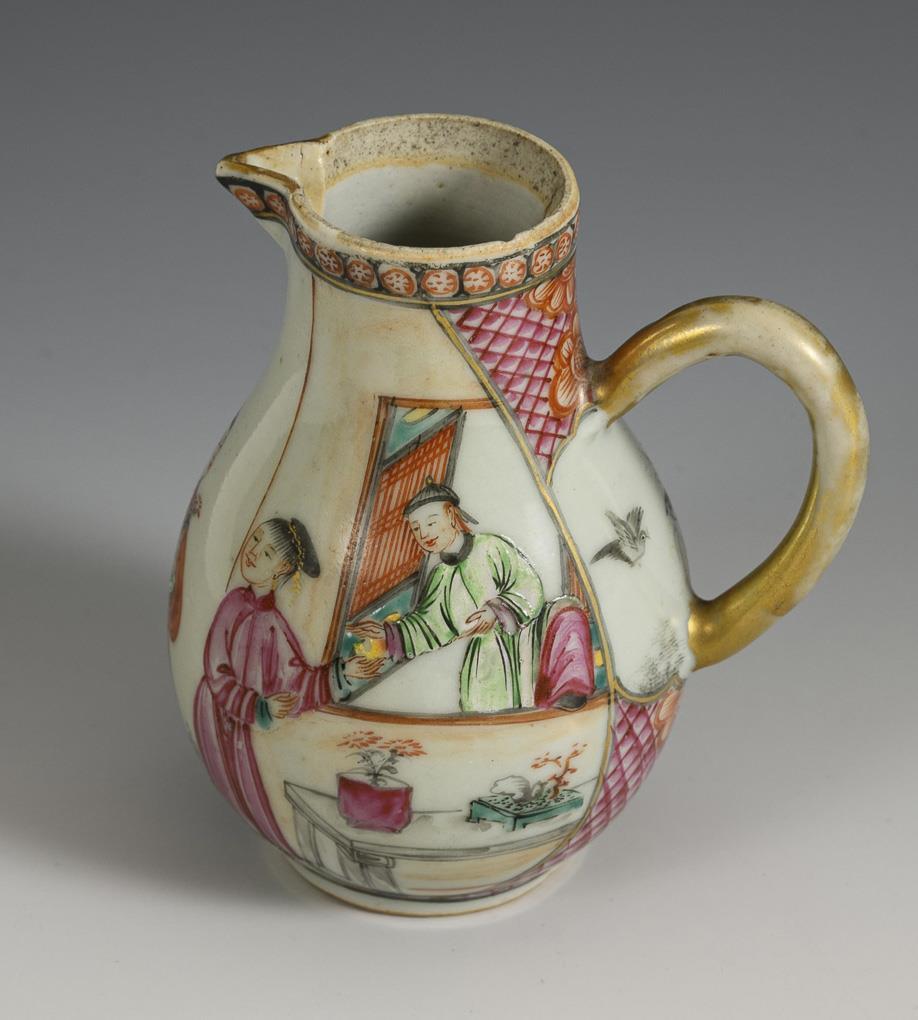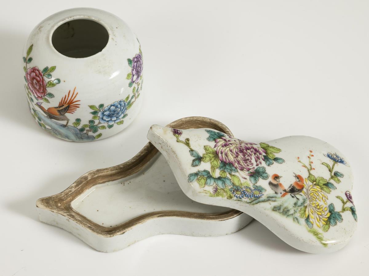 Small jug with figural painting. Rubbed gold, firing crack inside, not visible from the outside. H 11 cm. / Box in stylized pumpkin shape. Lid with peony blossoms and birds. L 12 cm. / Small jar with flowers and bird painting. Marked Guangxu (1875-1908), H 5 cm.