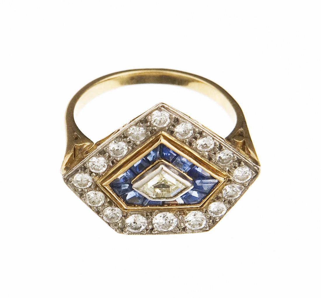 Open-worked pentagonal shape, central pentagon with diamond and small sapphires, framed by 16 small diamonds, delicate stable shank. Without hallmarks, fineness tested with acid.