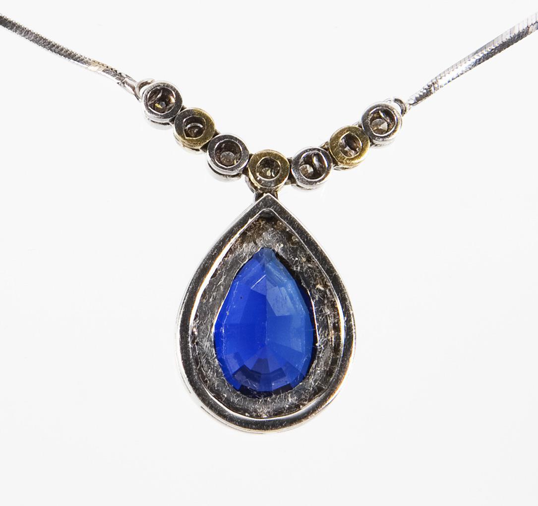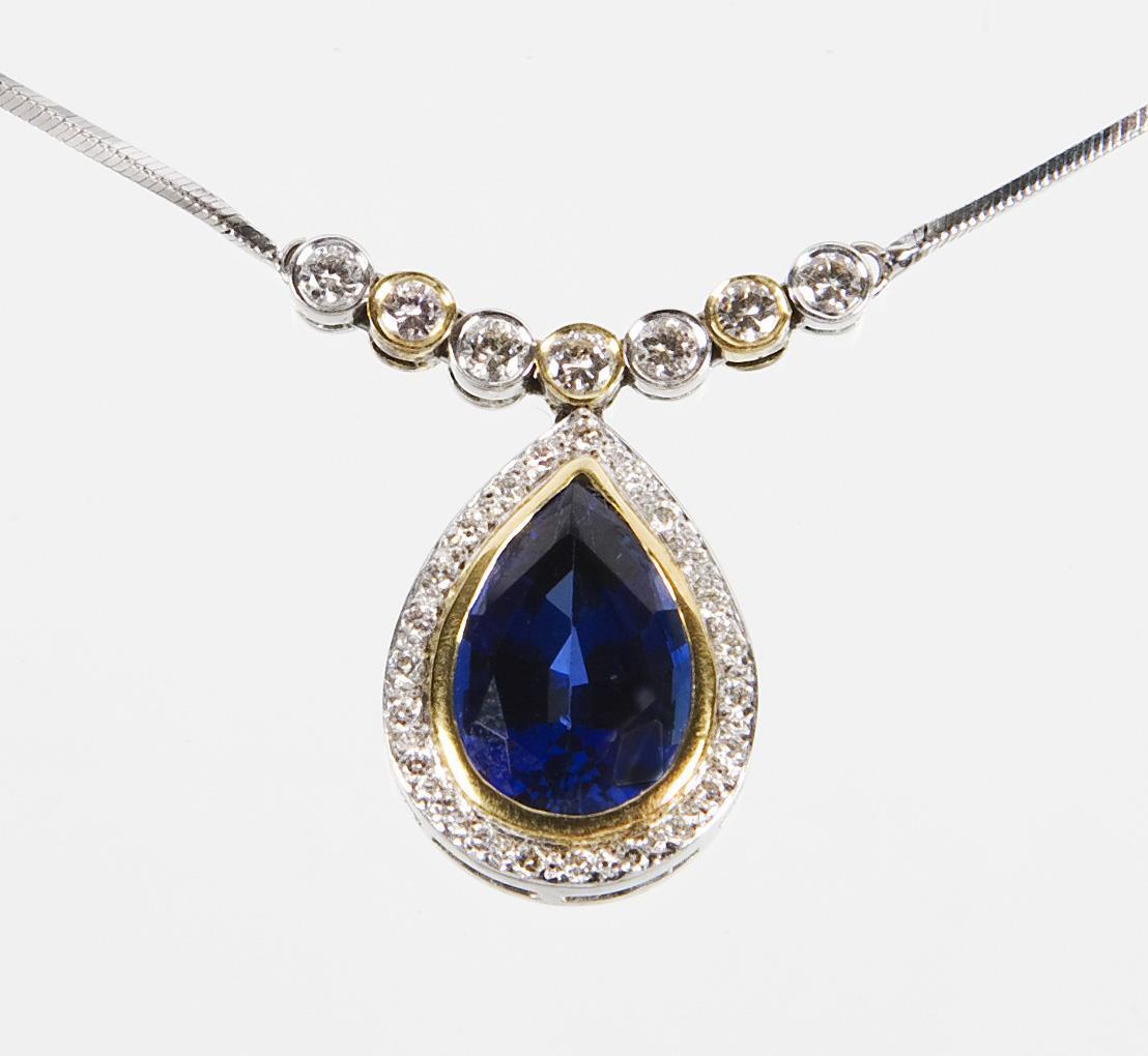 Deep blue faceted lazulite in drop shape, 7 small brilliant-cut diamonds approx. 0.35 ct, numerous small diamonds. Graceful chain with small lobster clasp. Hallmarks: Fineness, jeweler's mark Midas.