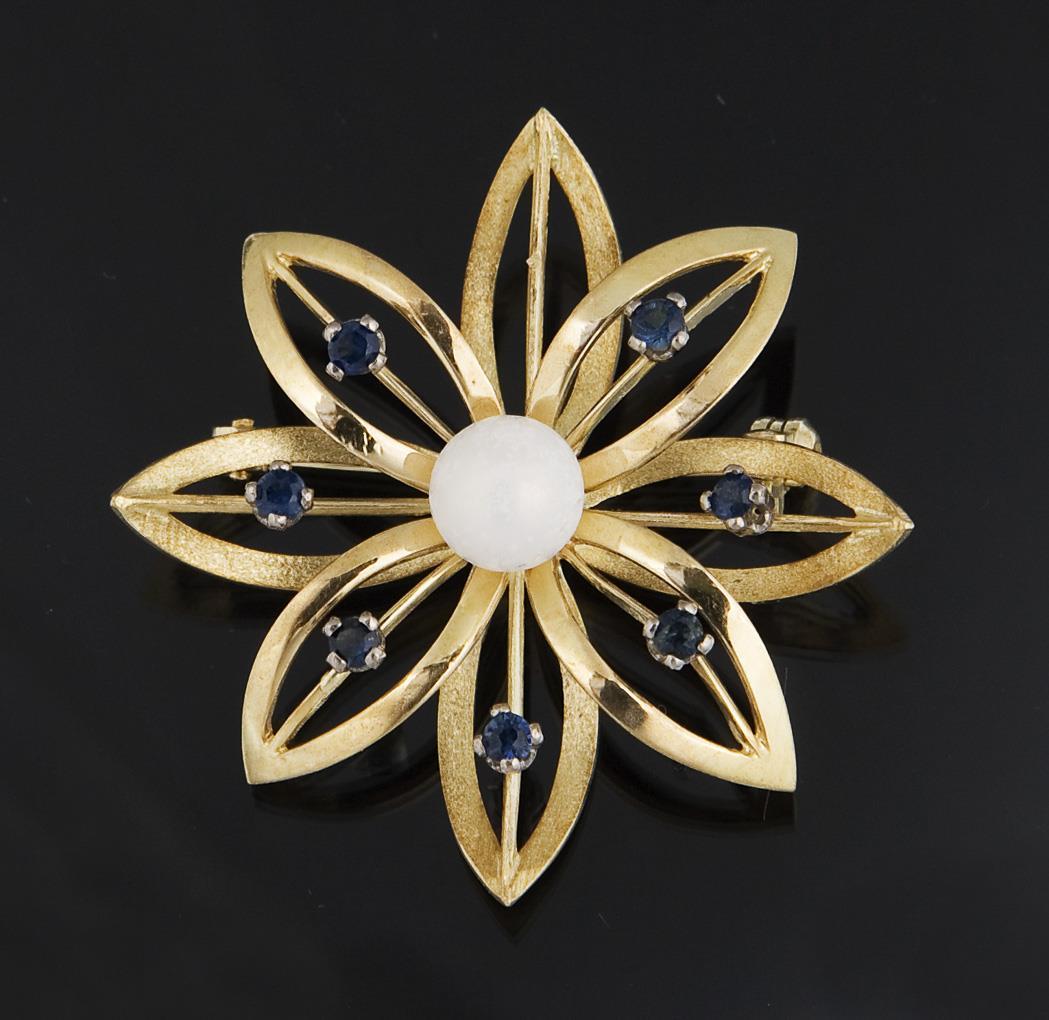 Openwork, 7 small sapphires in prong settings, cultured pearl. Hallmarks: Fineness, jeweler's mark FB. The outer layer of the pearl is damaged, 1 sapphire missing.