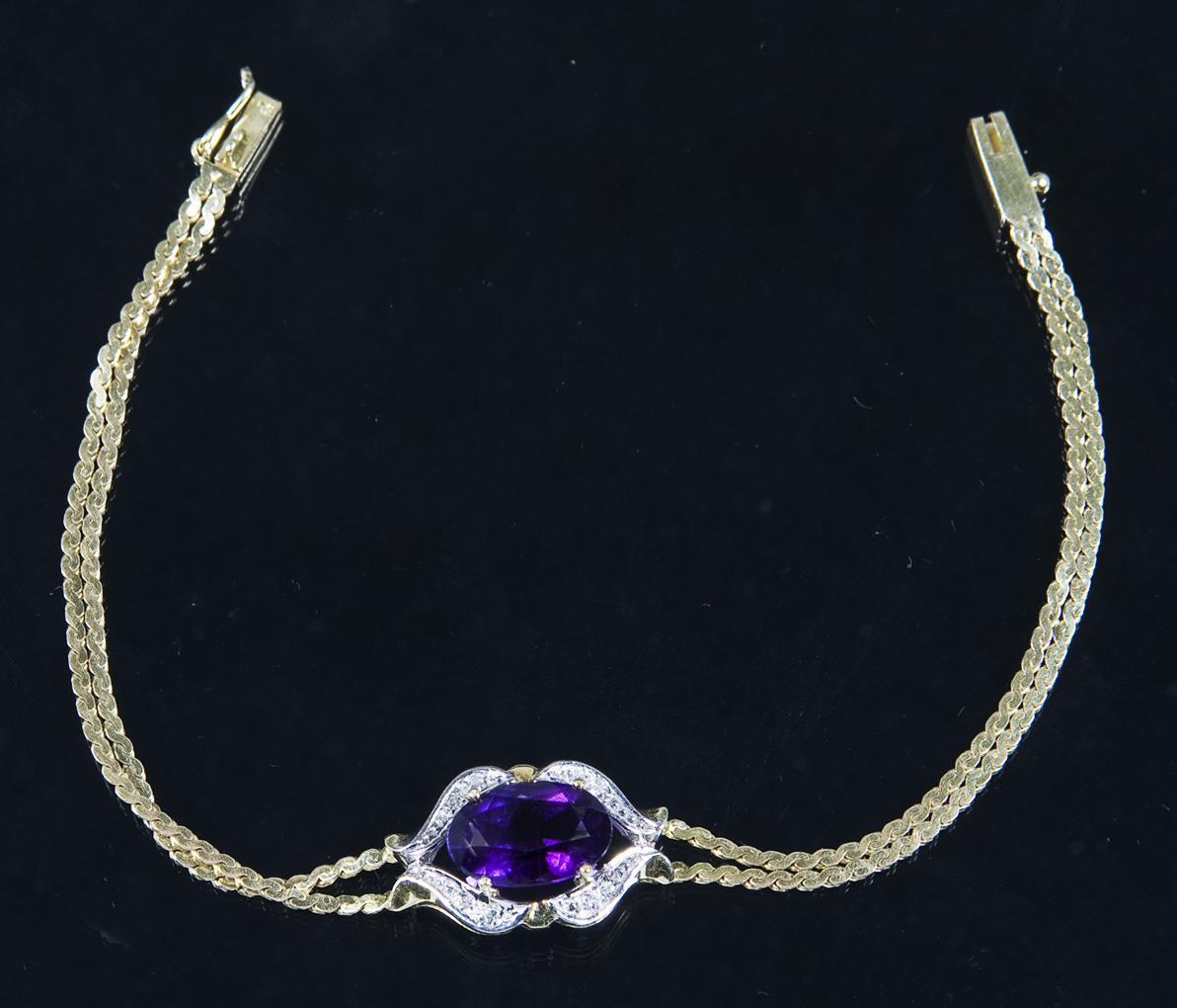 8 small diamonds 0.1 ct, faceted amethyst approx. 12 x 8 mm in prong setting, delicate band, box clasp with eyelet. Hallmarks: Fine, engraved diamond carat.