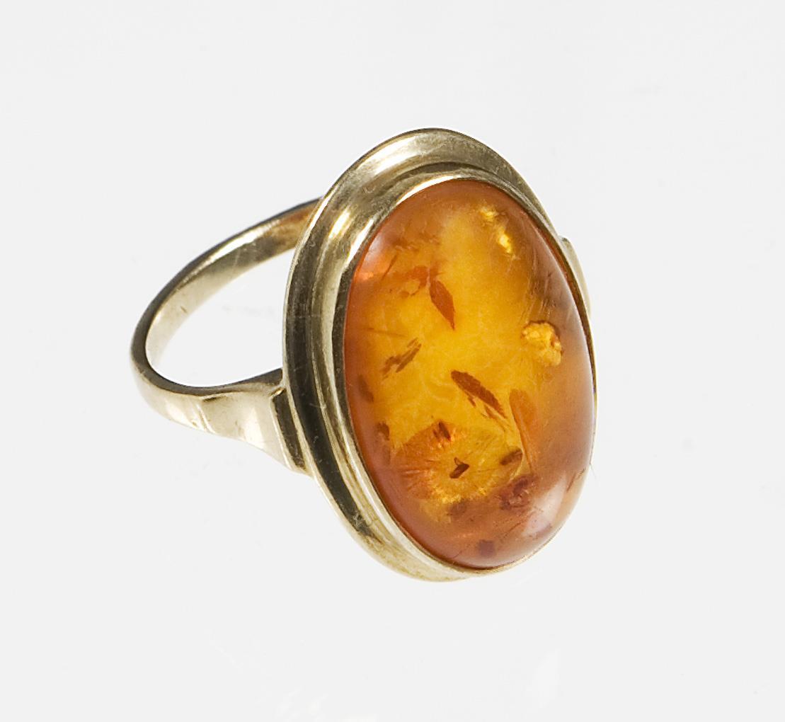 Oval amber cabochon approx. 18 x 12 mm in bezel setting, narrow shank, hallmarks: Fineness.