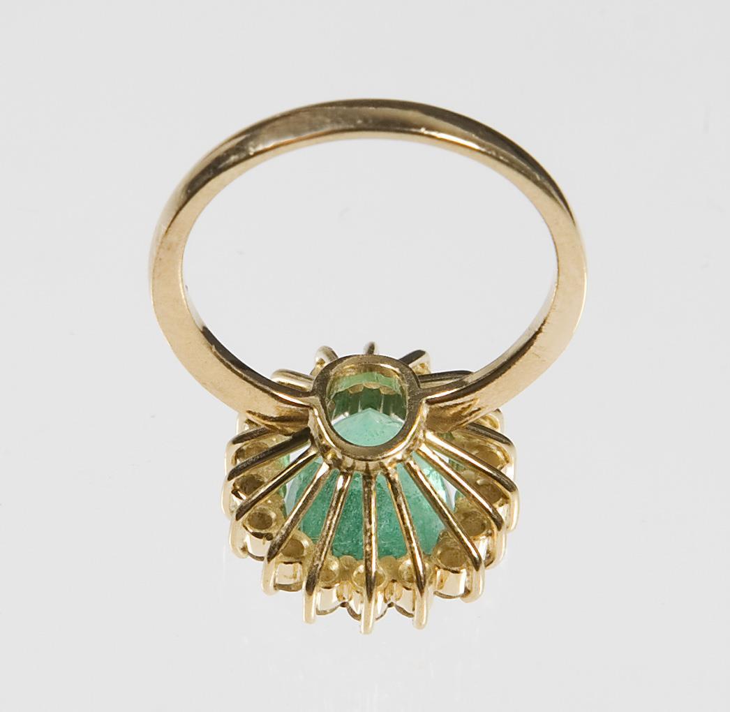 Facetted emerald approx. 10.5 x 7.7 mm, surrounding 18 small brilliant-cut diamonds in prong settings, stable shank, hallmarks: Fineness.
