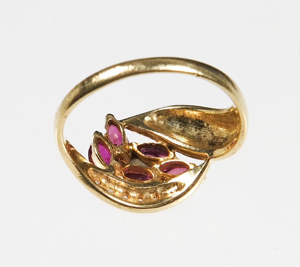 Curved floral shape, 5 rubellite navettes approx. 4 x 2.6 mm in prong settings, 6 small diamonds on the sides, narrow shank, hallmarks: Fineness.