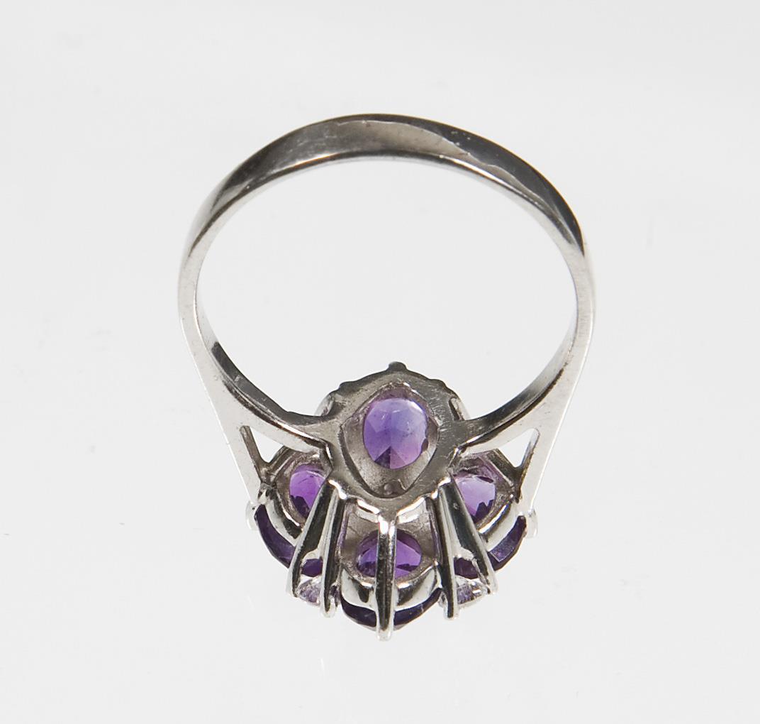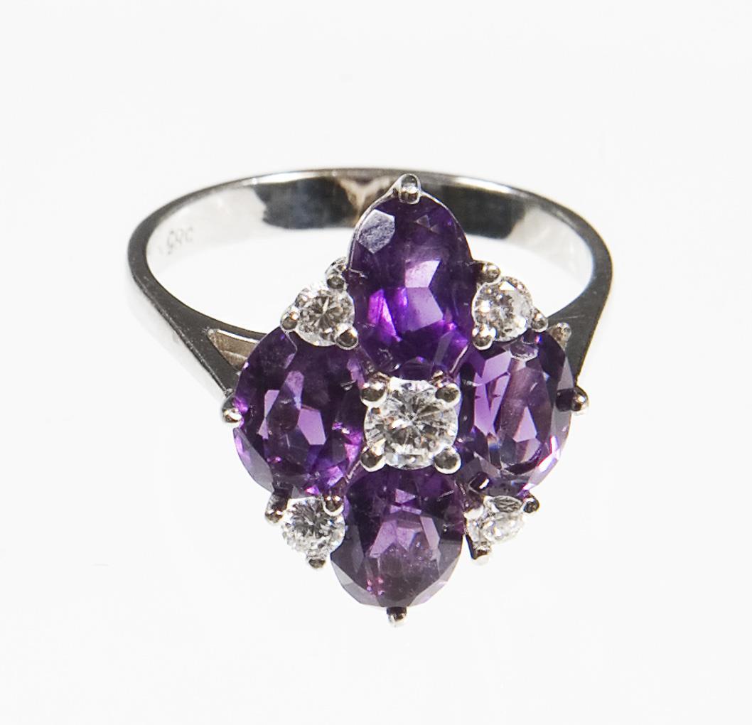 4 faceted oval amethysts approx. 6 x 4 mm, 5 small brilliant-cut diamonds approx. 0.3 ct in prong settings. Stable bar, hallmarks: Fineness.