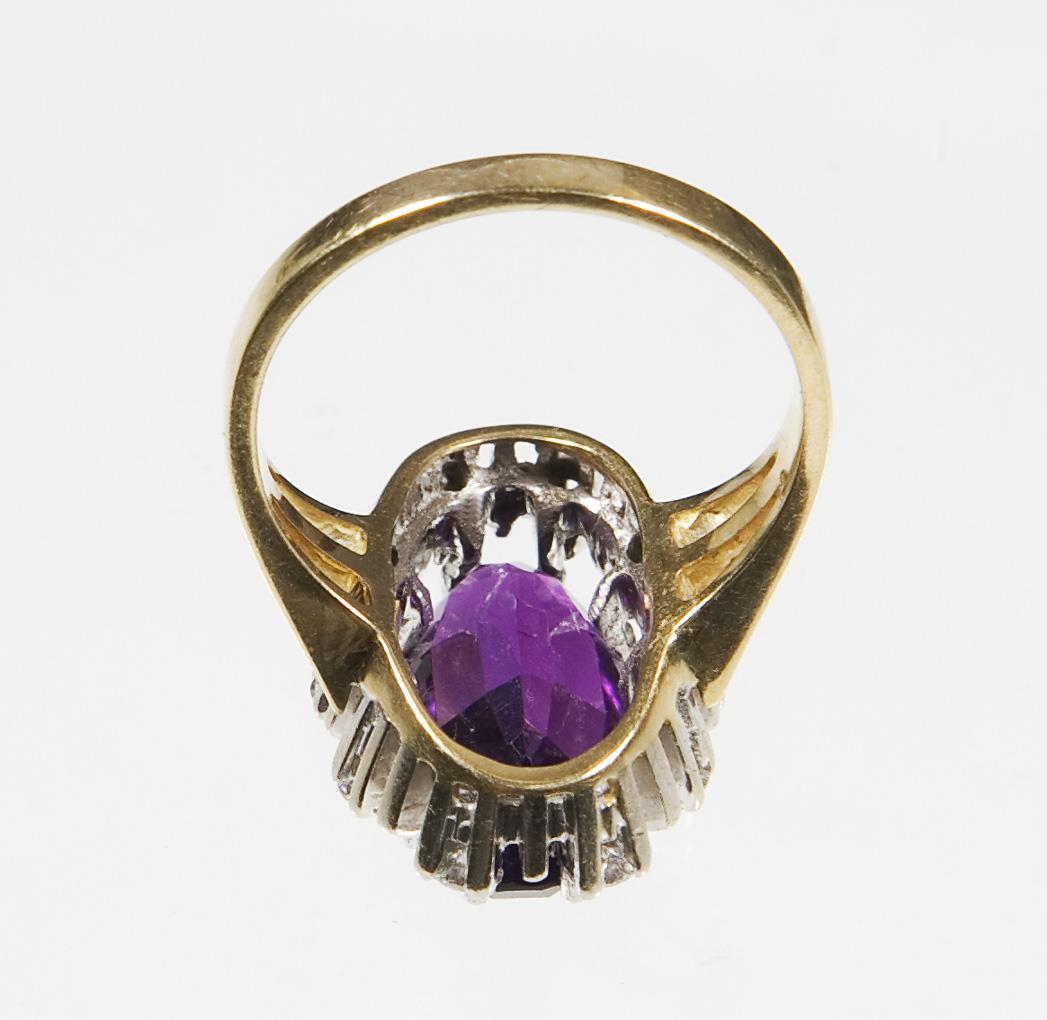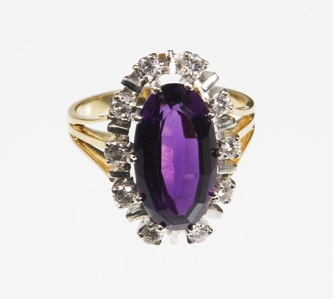 Oval faceted amethyst approx. 14 x 8 mm, 10 small brilliant-cut diamonds approx. 0.3 ct in prong settings. Stable bar, hallmarks: Fineness.
