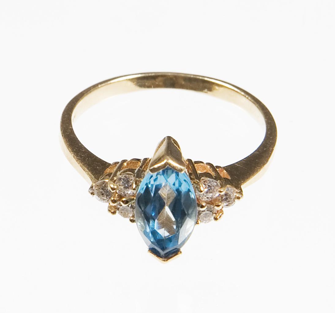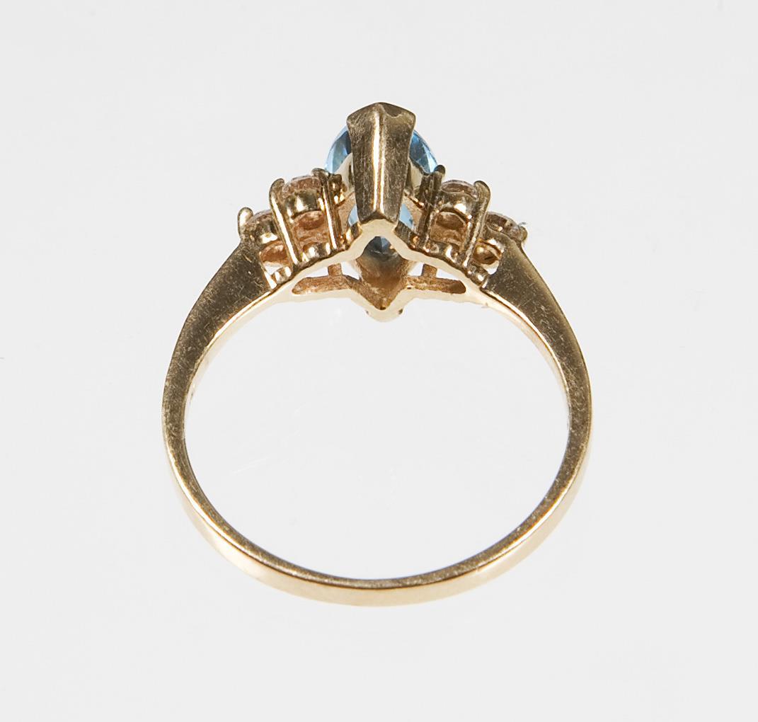 Facetted oval aquamarine approx. 9 x 5.4 mm, 6 small brilliant-cut diamonds in prong settings on the sides, stable shank, hallmarks: Fineness.