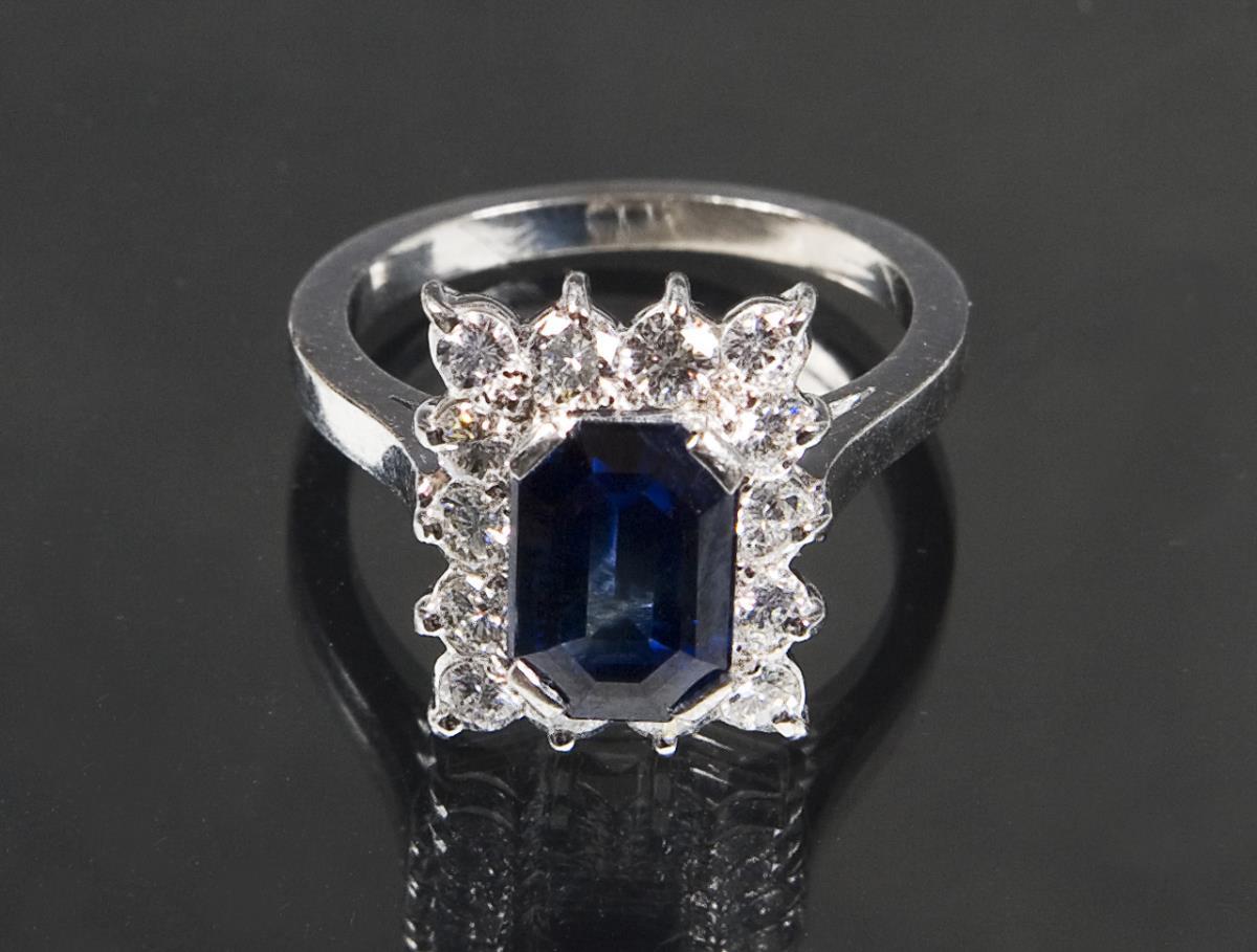 Faceted sapphire circa 9 x 6 mm, surrounding 14 brilliant-cut diamonds in prong settings circa 0.8 ct. Stable shank, hallmarks: Eagle's head, indistinct lozenge mark.