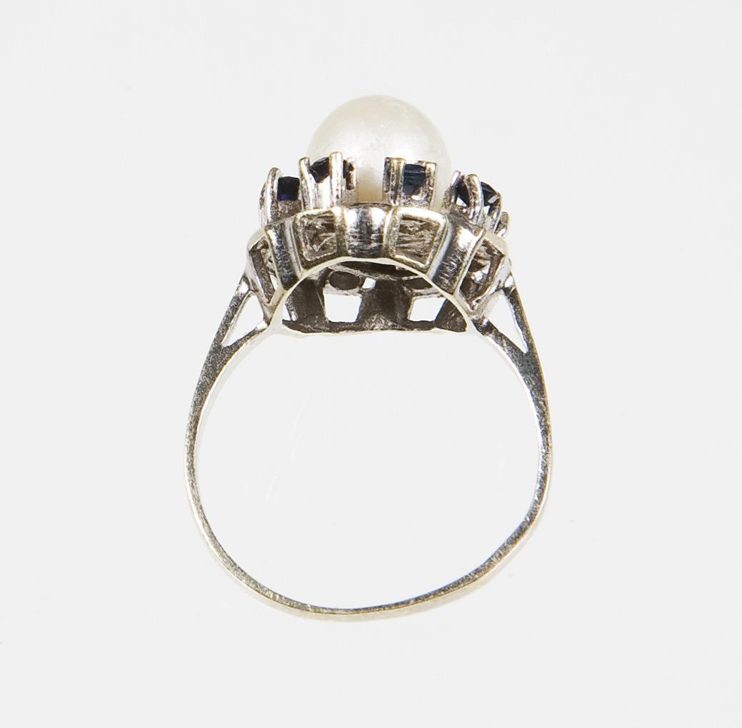 Cultured pearl, surrounding 8 small sapphires in prong settings, delicate rail, hallmarks: Fineness, jeweler's star mark. The outer layer of the pearl is damaged, signs of wear.