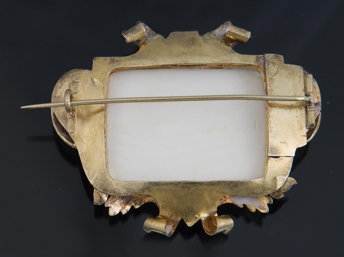 Elaborately worked form, cut angel skin coral with antique double porträt, without hallmarks, fineness tested with säft. Restored on the back of the pin.