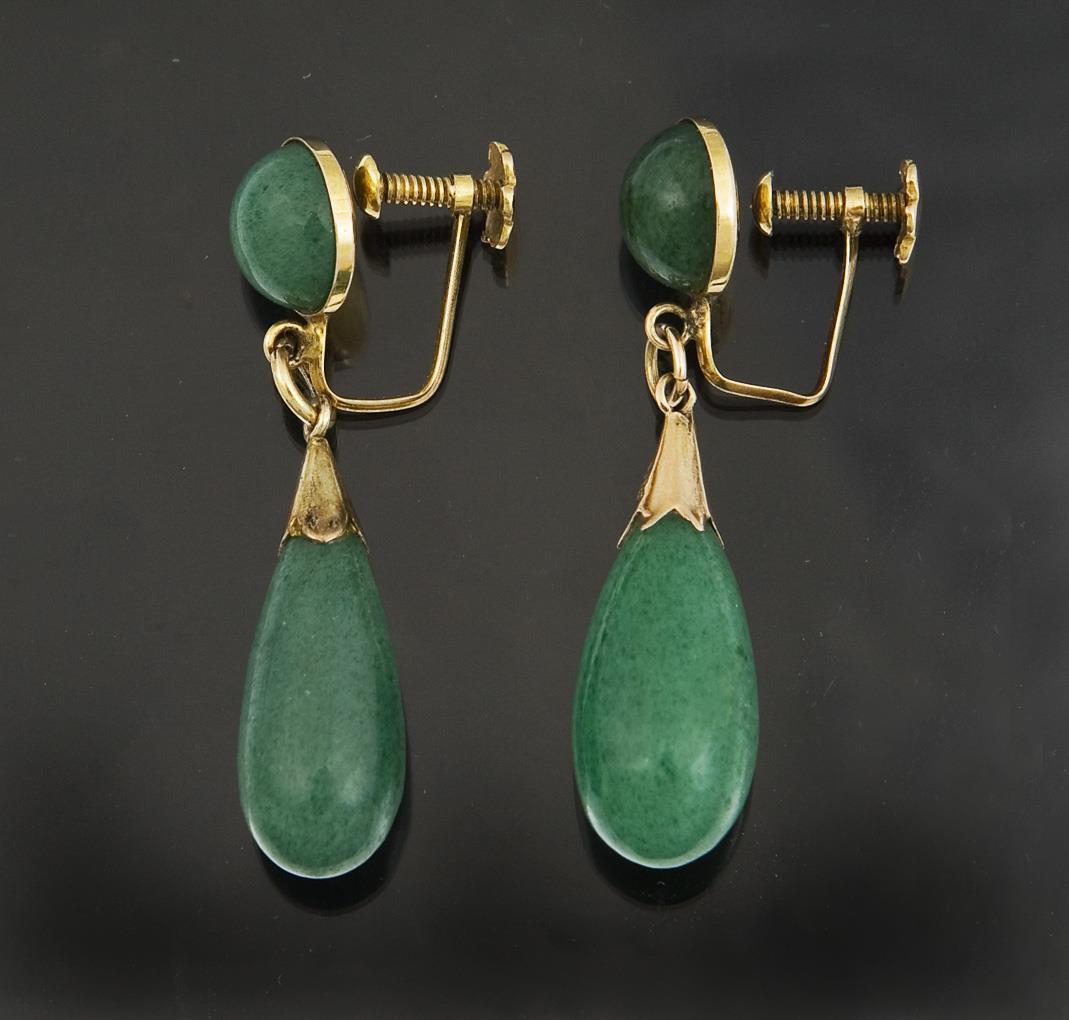 2 nephrite drops, 2 round nephrite cabochons, screw back, hallmarks: Fineness.