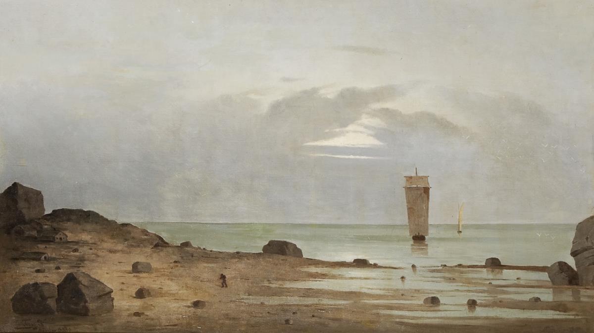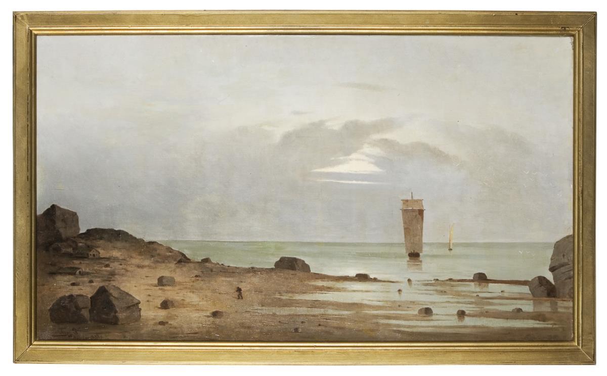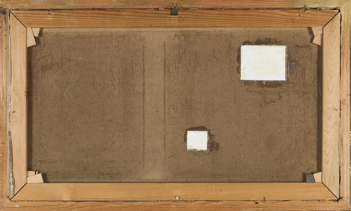 A landscape detail characterizing tranquillity in light colouring. Gold frame. Two patches on the reverse.