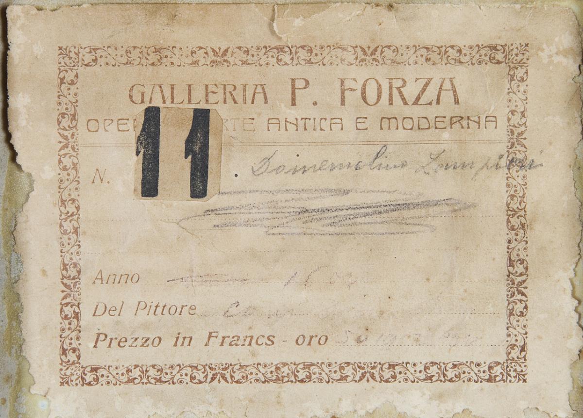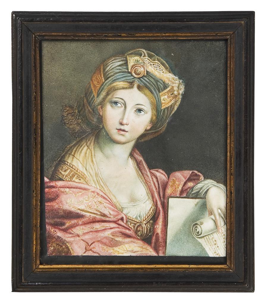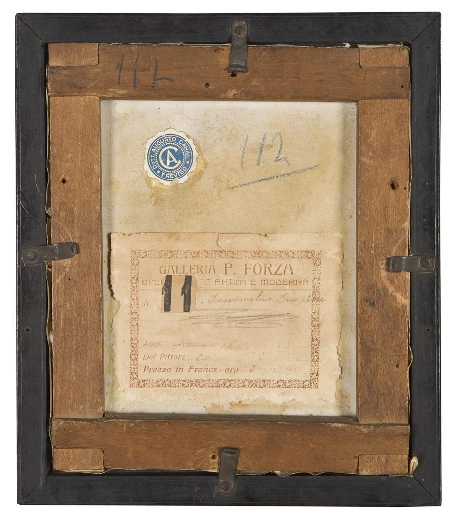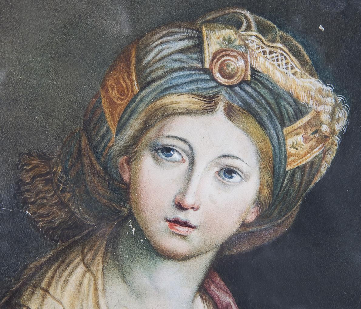 Sibyl, a priestess from Babylon who presided over the oracle of Cumae (ancient city near Naples) in the 6th century BC. The original painting is in the Galleria Borghese in Rome. Old adhesive labels on the reverse: Galleria P. Forza and Dott. Augusto Canal Treviso. Glazed blackened profile frame. Small losses of color in places, lower corner torn.