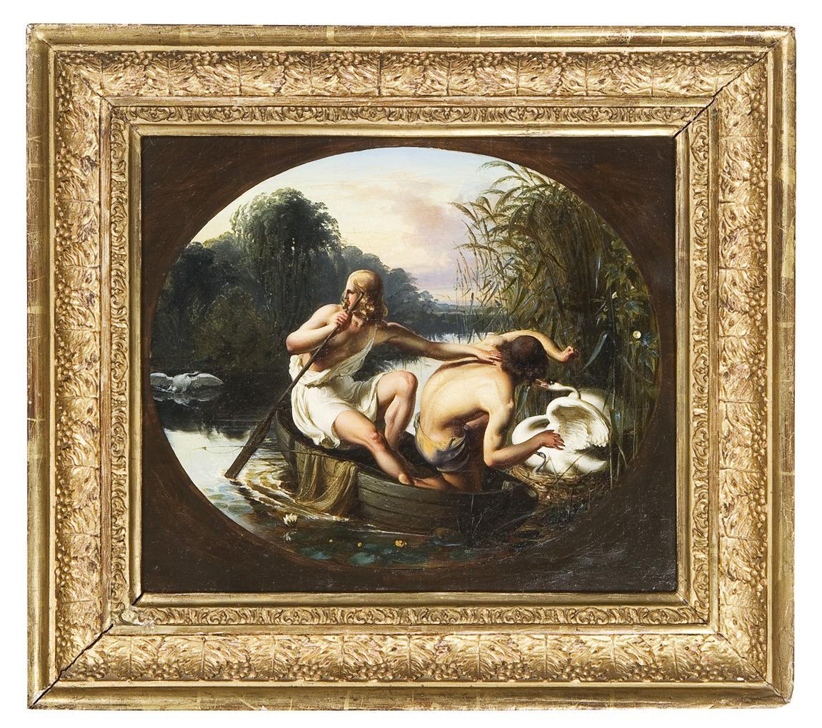 An excitingly moving scene in a romantic pond landscape of dignified execution. Original stretcher, gilded stucco frame. Frame partially defective, partially craquelé.
