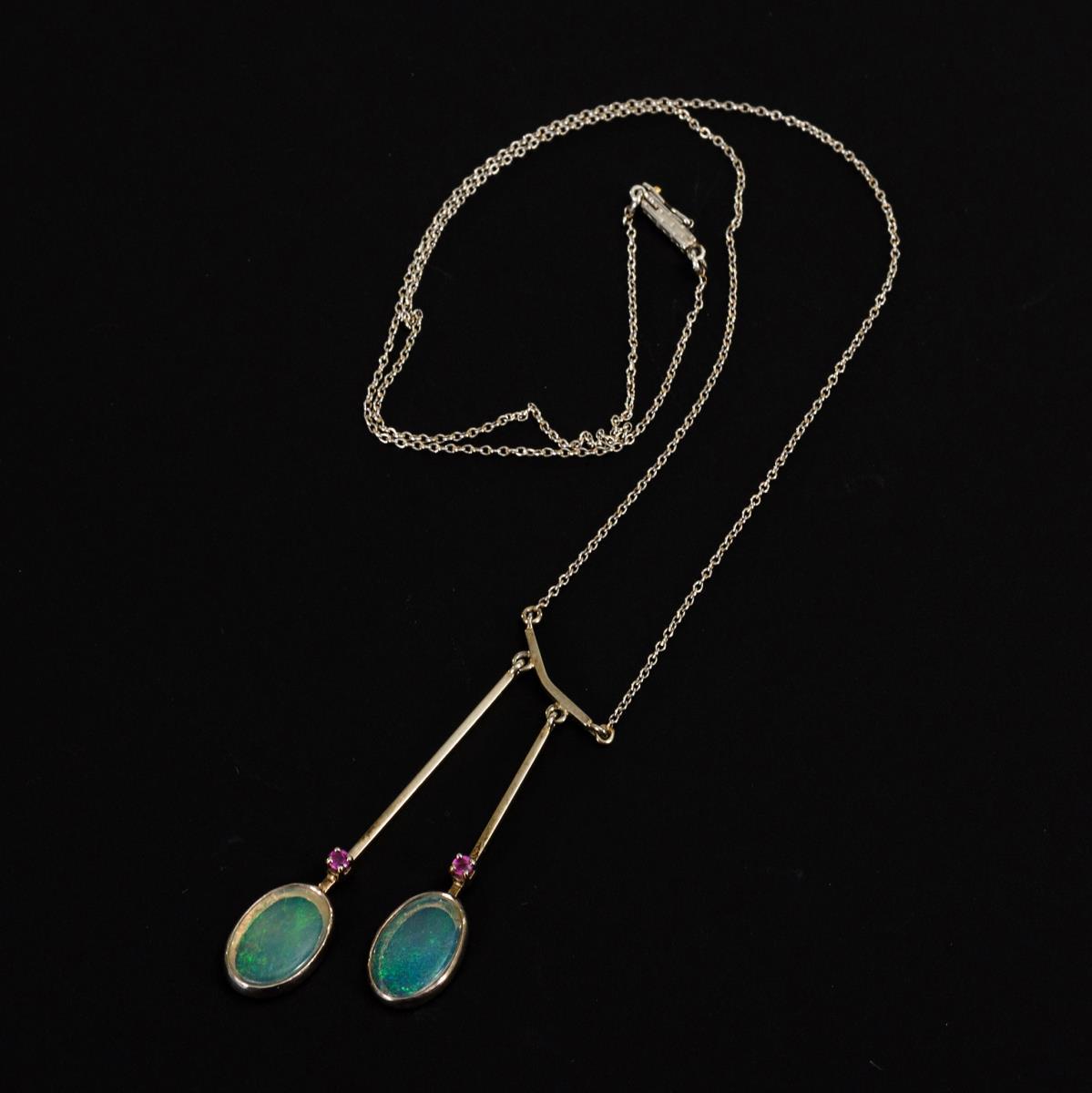 Opale zus. ca. 2,18 ct, Rubine zus. ca. 0,05 ct. Kette L 42,5 cm.
