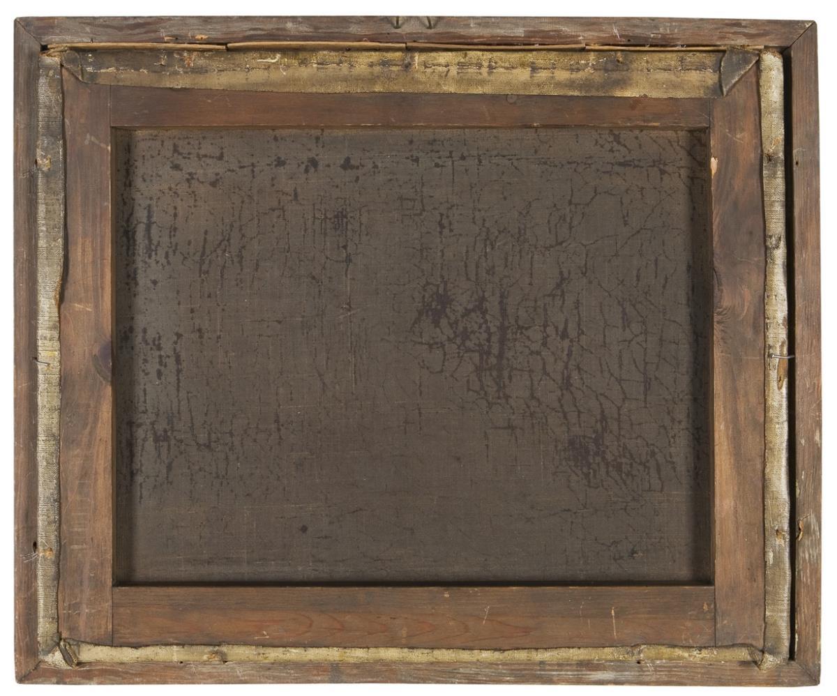 Peaceful, simple village surroundings with a staffage of figures. The low horizon is partially overlaid by trees. Profiled wash gold frame. Craquelé, frame slightly damaged.