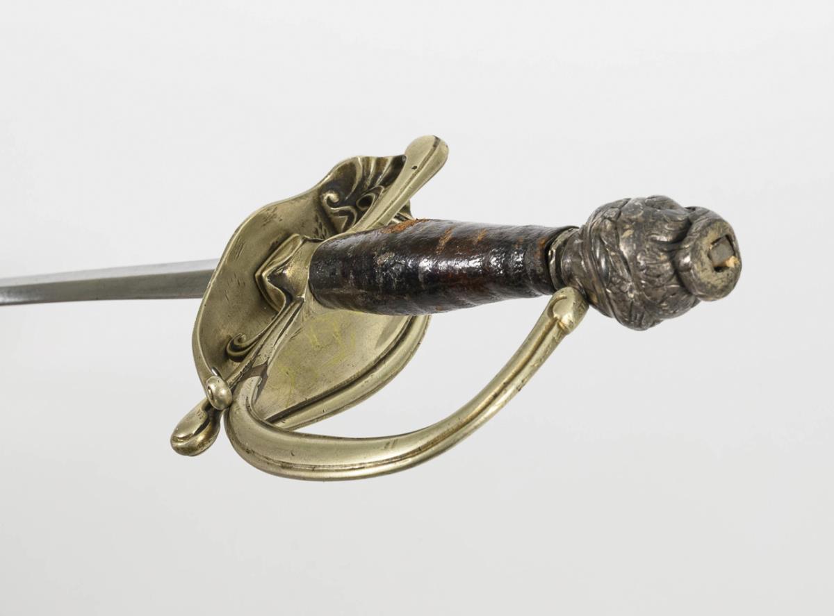 Short, straight blade with central ridge. Half guard (somewhat loose), two small finger grips, grip with leather winding. Silver pommel in the shape of a helmet, tip sharpened, tang visible.